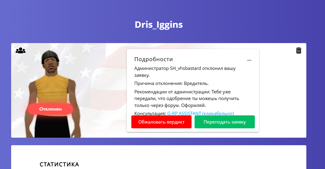 Суть жалобы: сказал одобрение через форум получать, хочу регнуть фраку с поцыками поиграть себе в кайф, не знаю с каких пор я вредитель ибо конкретно кому то я не навредил никого в стадию не кидал