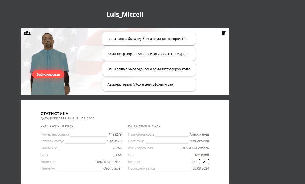 Суть жалобы: давным давно забанили за то что с другом домогались до трансгендера предварительно знали кто он что он, хотели вывести в лес ограбить. По итогу нас откинули, прошу прощения за эти действия (если честно так и не понял за что нас забанили но допустим) сижу с августа, хотелось бы извинится и получить разбан..