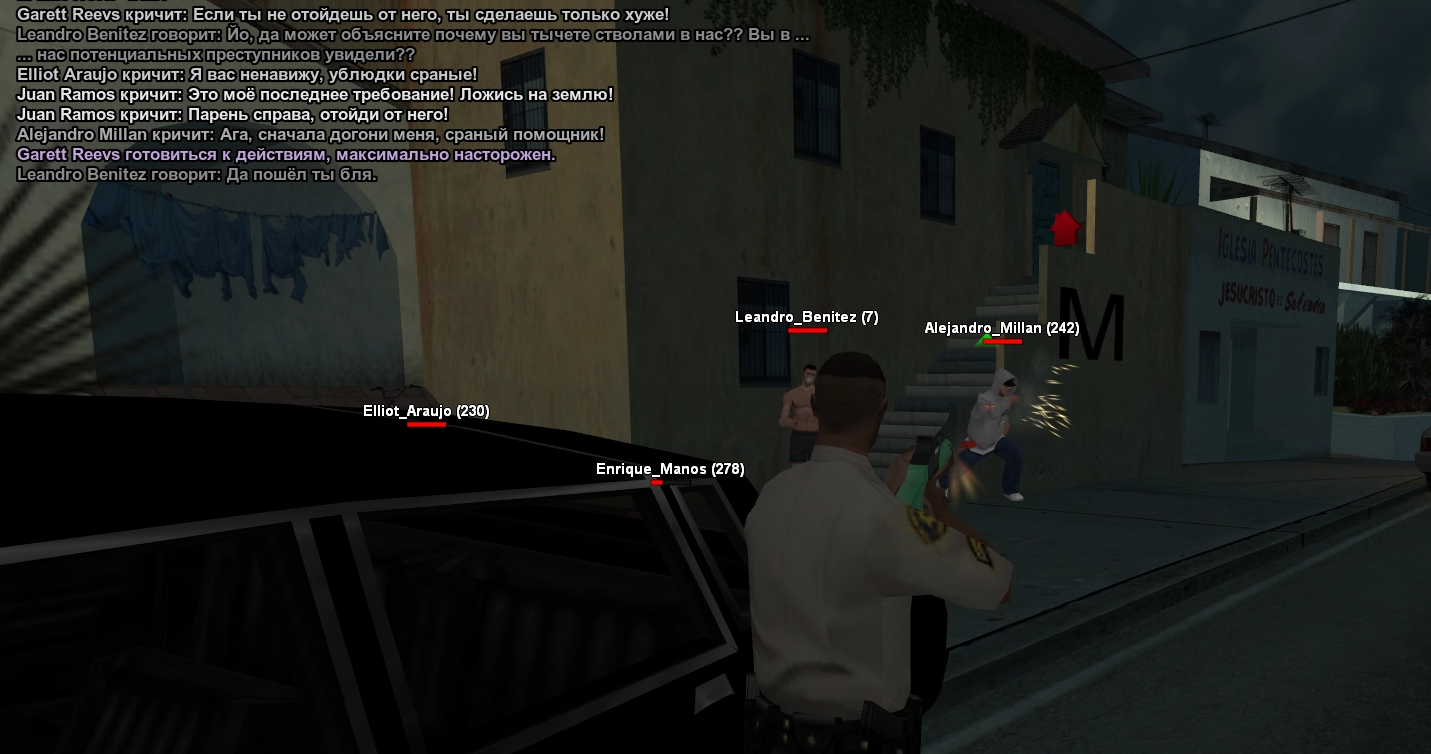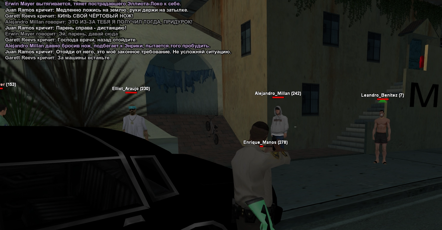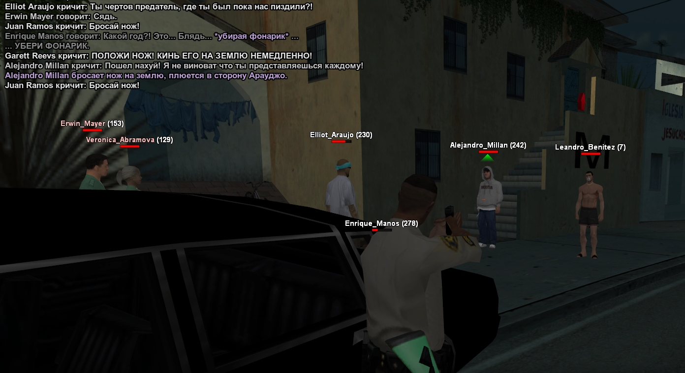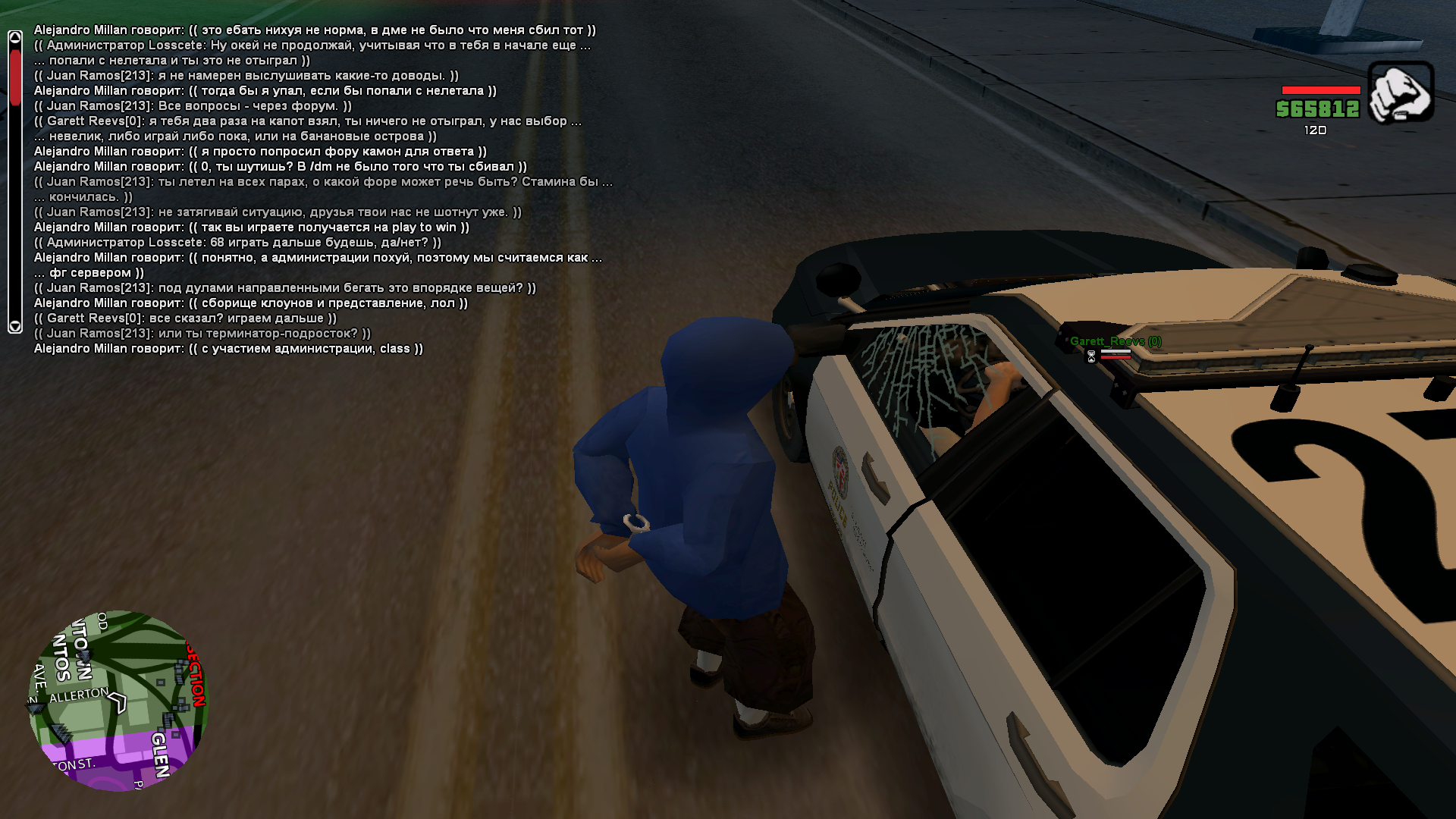 На твоем скрине видно, как я бросил нож плюсом мой персонаж был под состоянием адреналина и в испуге, так как на него несколько минут назад наводили ствол и он был при смерти. А И КСТАТИ, по айси мы знакомы с Энрики еще с раннего детства, когда мы только встретились в Лас-Колинасе по айси, это можно определить в моем топике СП, мы оба переживаем по айси за друг друга и похер на эти требования. Если твой родственник будет чуть ли не при смерти на твоих глазах то сам подумай, ты будешь в отчаянии и попытаешься оказать помощь или ты будешь целиться? Вот и думай.