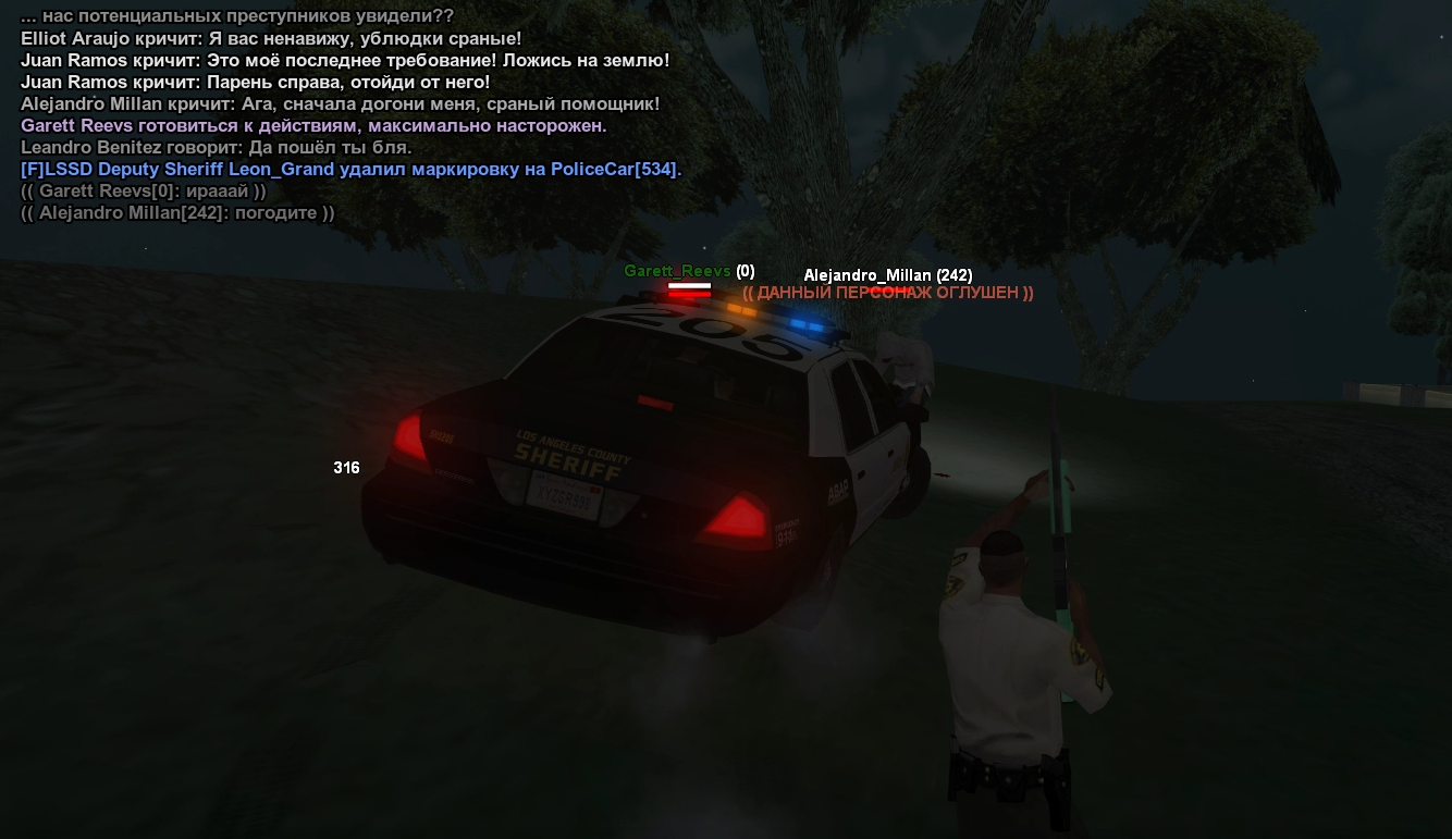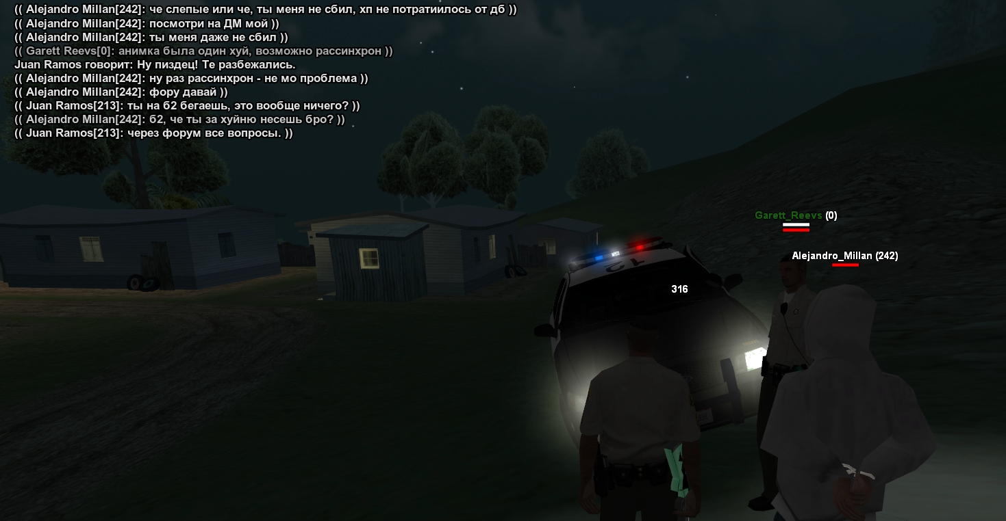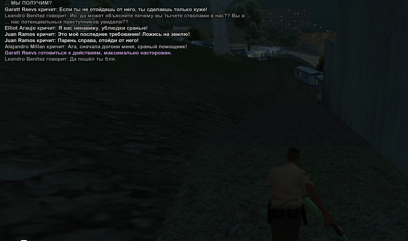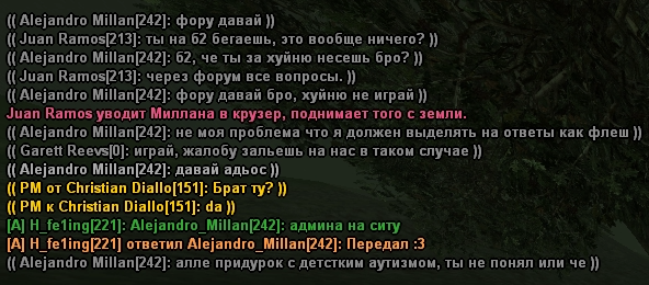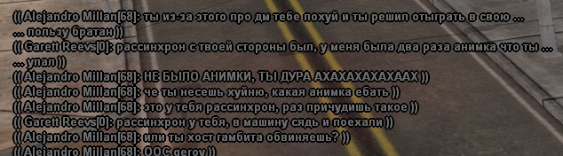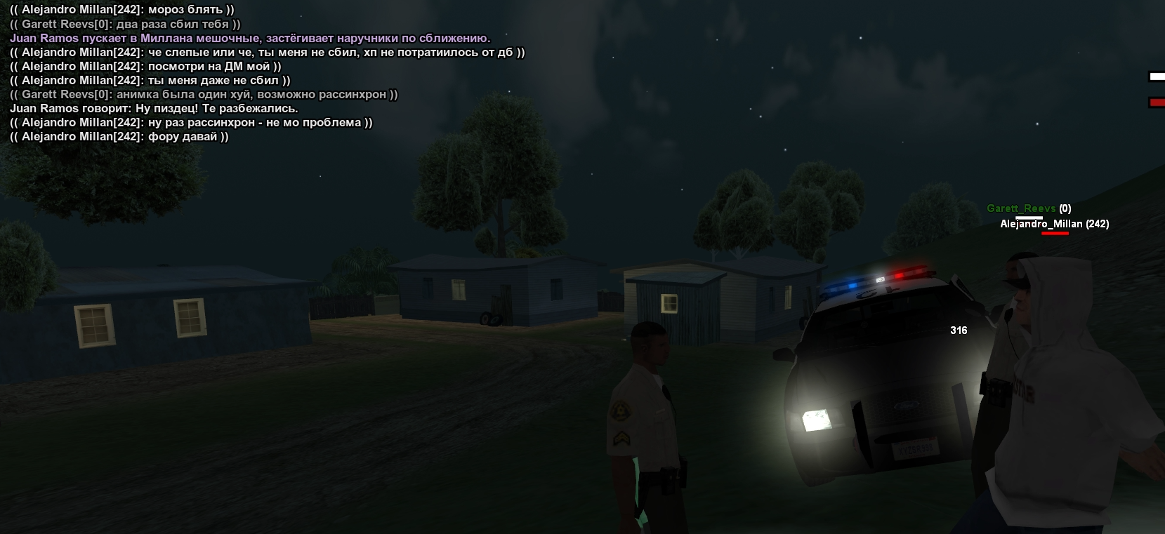 Ситуация: Играли ситуацию помощники, что типо там наших избили все дела и я выхожу из дома, в руках нож, само собой после той драки и потасовки мини со стороны 39-го движения(их перебили), так как мой персонаж на нервах. Помощники просят бросить оружие, я бросаю и подбегаю к Рондо, так как мы чуть-ли не братья наши меньшие и пытаюсь того привести в чувства, затем отхожу и они говорят мол: Ляжь на пол, персонаж само собой их послал на всё три стороны и побежал, их нелетал не сработал и я бежал-бежал, мне помощник в оос говорит играть и я не понимаю про че, я останавливаюсь и пытаюсь ответить, тем временем второй помощник подбегает и без размышления в своем дряблом мозгу тупо играет рп, я говорю мол мороз ситы насчет этого - он игнор мои слова, нифига не отвечает, второй помощник который на машине говорит мол меня сбивал, я говорю - покажи это в /dm, он говорит про МОЙ РАССИНХРОН, администратор приходит на ситуацию и тупо мне выдает мут в ООС, я пытаюсь в айси объяснить уже бомбя, тот дает и в айси, тоже самое мне пытается твердить, я пытаюсь им что-то сказать и меня крашает, тем самым сбивая /dm (может не сбило, не уверен). Из этой ситуации я лишь просил дать фору, так как я отвечал на ООС сообщение от помощника за рулем и тупо бы не успел убежать сразу же.