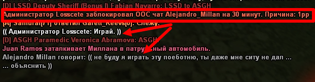 Блокировку тебе выдал за затягивание ситуации и конечно за любимый первый пункт правил, обычное задержание длилось дольше 15 минут, ты каждую секунду своего бессмысленного извержения в чате, затягивал ситуацию. Тебе несколько раз сказали /Играй ситуацию/ даже администрация, почему ты можешь себе позволить это, при всем при этом, когда ты отказываешься играть, я иду тебе на уступки и выдаю /bmute, но ты буквально через секунду продолжаешь писать и дальше в ic чат, но типо ставя скобочки (())