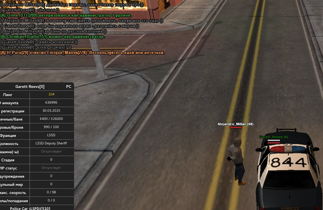 Затягивал ситуацию? Нет друг, виноват как раз таки твои помощники которых ты так сильно любишь и покрываешь. Давай ты будешь учитывать тот факт, что тот помощник на автомобиле специально просил играть давление меня автомобилем, но при этом в /dm не было. 1:15 момент на твоем же фрапсе, где у меня ХП 92, но при этом ХП 92 и осталось, ты это тупо скрываешь, но показываешь. 1:25 момент видно что он пишет играй, 1:31 останавливаюсь для ответа в 1:36 видно как меня по айси сажают. Я просил дать фору, ибо я писал в ООС ответ для ПОМОЩНИКА насчет "ИГРЫ", ты это конечно пропустил мимо ушел, зато вы как цепитесь за мою душу и лишь бы вам поднасрать где-то не там, что вы изначально спрашивали(к примеру за бег).