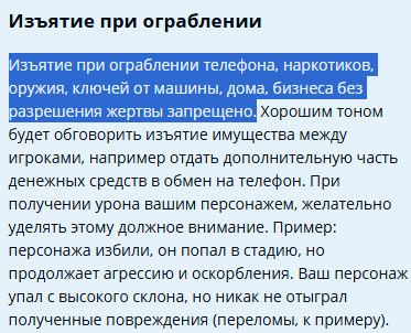 Исходя из пункта 23. Ограбления и Аферы, а именно подпункт "Изъятие при ограблении" указано, что: Изъятие при ограблении телефона, наркотиков, оружия, ключей от машины, дома, бизнеса без разрешения жертвы запрещено.