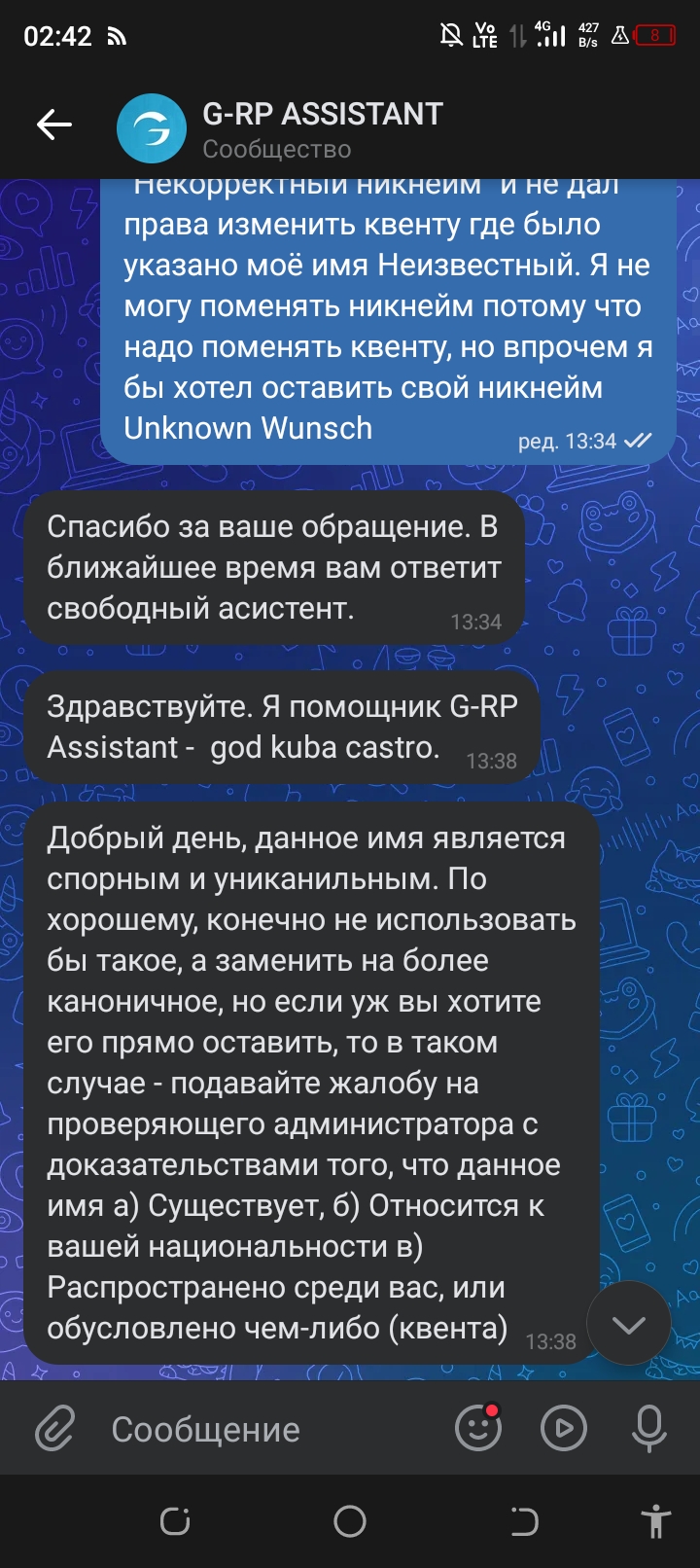 #638862. Такое имя существует в реальной жизни и его можно оставить носителю. Такое имя выдают людям без родителям , людям у которых родители философы или какой нибудь гендерной ореинтации, людям которым родители не указали имя в документах. Я указал в квенте почему мне дали данное имя. Администратор kingslayer отклонил мою заявку на создание персонажа по причине "Некорректный никнейм" и отклонил заявку на редактирование квенты где было указано моё имя Неизвестный. Я не могу поменять никнейм потому что надо поменять квенту, но впрочем я бы хотел оставить свой никнейм Unknown Wunsch. (Квенту скину в ЛС вк если нужно)
