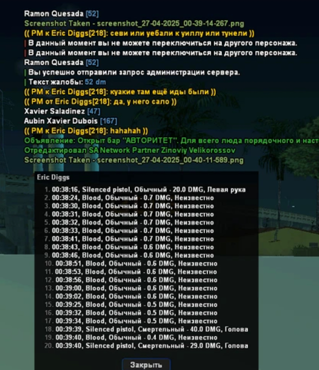 со стороны своих игроков я могу признать лишь некоторые некорректные фразы которые действительно были здесь ни к чему и смысла никакого не несут. Прикладываю еще один скриншот соигрока на котором явно видно что так называемый Eric Diggs действительно открывал огонь по игрокам, причем в близлежащим районе от которого после и началось его выслеживание и дальнейшее убийство