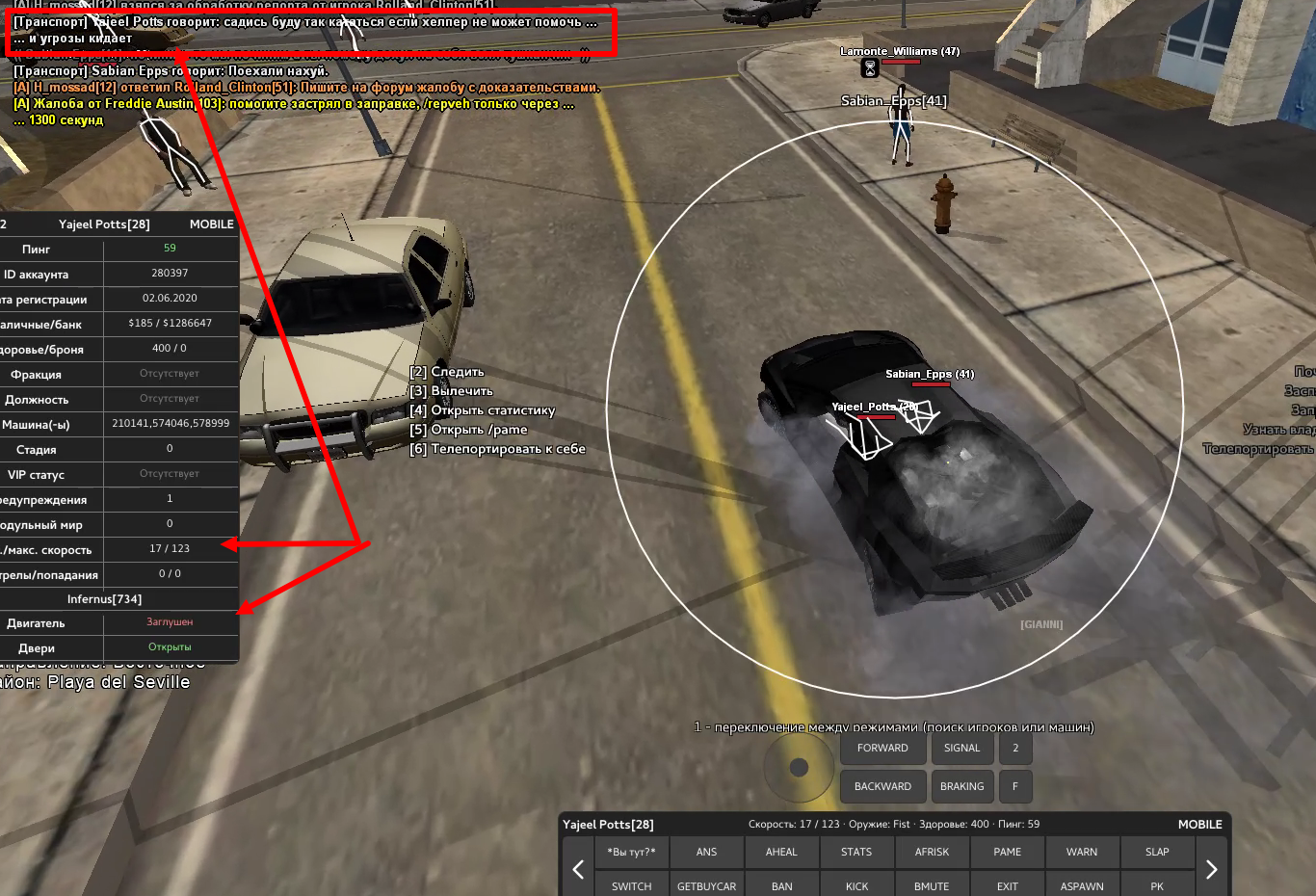 Зайдя на старый аккаунт, я обнаружил проблему с автомобилем — я не могу его починить, поскольку при нажатии на кнопку "Н" меню починки не открывается. Понимая, что самостоятельно решить проблему не получится, я обратился к хелперу H_Tushcanchik. Я предложил компромисс: он чинит машину, а я в ответ сливаю эквивалентную сумму денег в Charity, чтобы не нарушать экономику сервера. Однако хелпер ответил, что без "технической причины" починку проводить не будет и предложил чиниться самостоятельно.