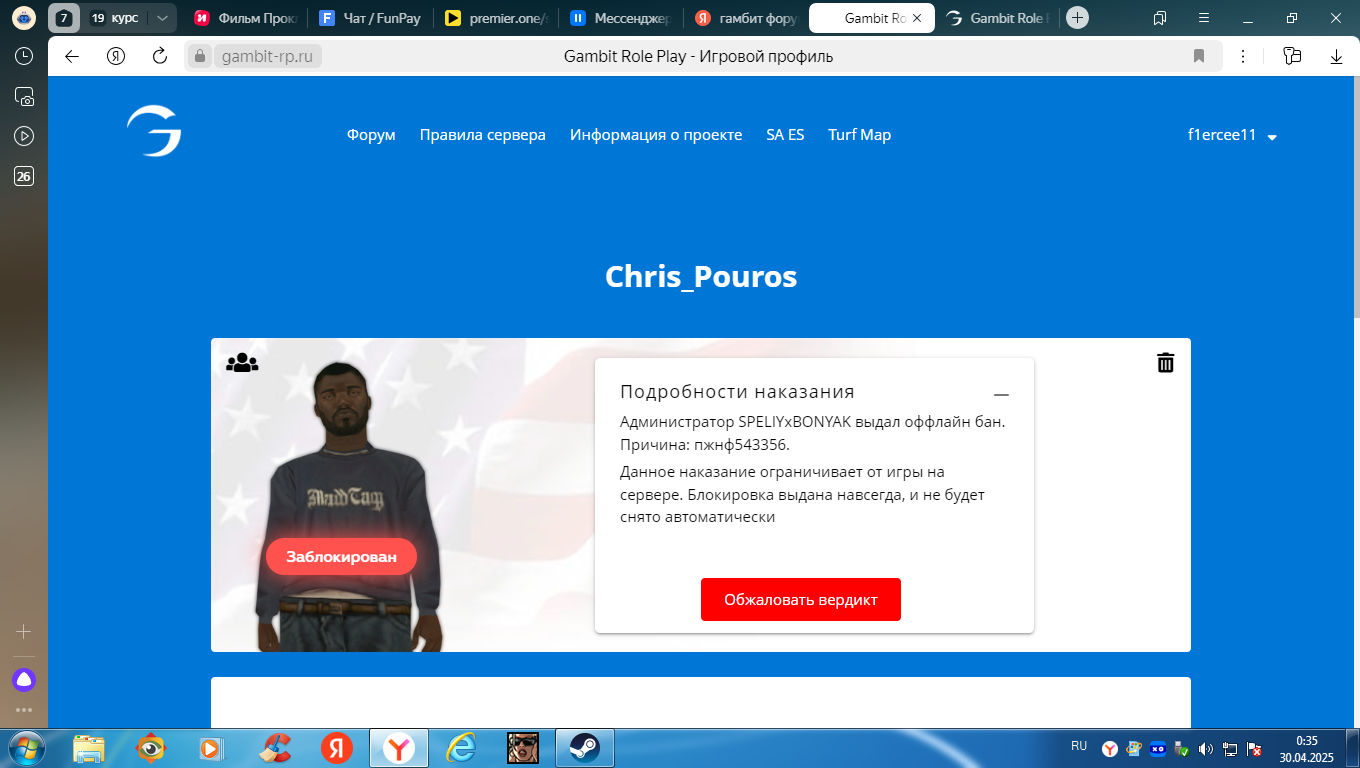 Суть жалобы: за что бан? не могу найти жалобу, скажите я не понимаю