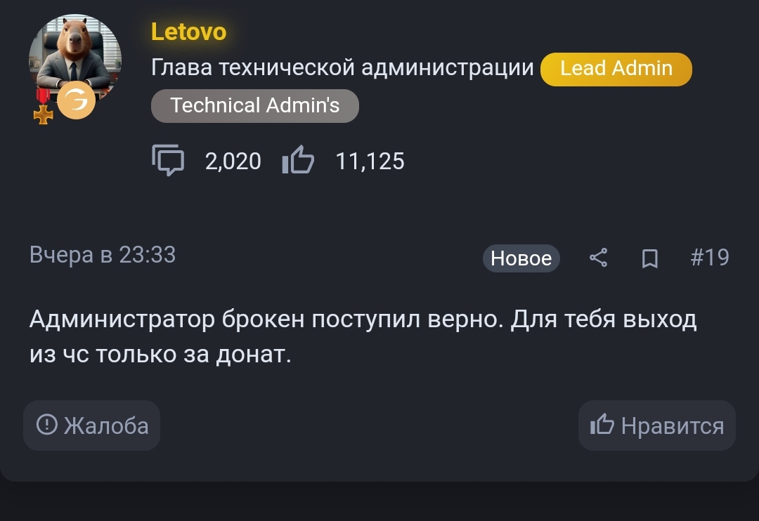 Суть жалобы: Не понимаю прикола. Ждал почти 5 дней пока мою жалобу проверят, по итогам получил - отказано, с чем я не согласен. У меня всегда был выход из ЧС путём реабилитации до этого момента, но после того что скинул броукен под хайдом у меня его забрали. У меня вопрос что за прикол такой он скинул, что у меня забрали такую возможность? Я хочу разобраться по нормальному, поэтому хочу что-бы ответ дал Ярослав. Попал я в чс по 3 пунктам - ДМ(которого не было, как я считаю), собственный шоп(в котором ни 1 продажи не было), ну и софт. И я не имею права на 2 шанс? Почему тогда другие чсники которые больше правил нарушили спокойно получают реабилитацию и бегают по серверу, а я должен сидеть в ЧС и тупо выходить онли за бабки. Всем дают 2 шанс, почему я его не могу получить? Мне даже проявить себя не дали на реабилитации. Позже расспишу ещё.