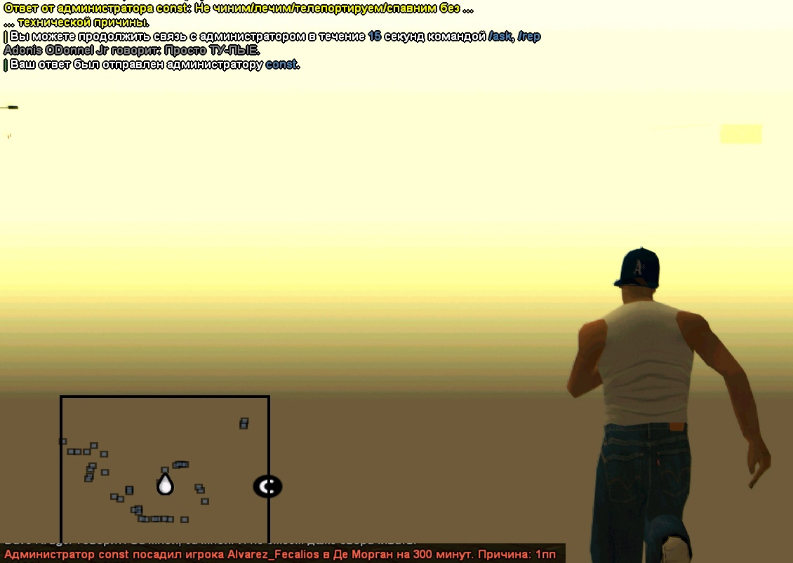 Суть жалобы: упал куда то за текстуры, попросил тпнуть к соигроку, на что получил всем известную уже бесячию фразу "без тех причины не тпеем", забомбил и ответил агрессивно администратору, за что получил 300 минут дмг, прошу снять наказание на первый раз