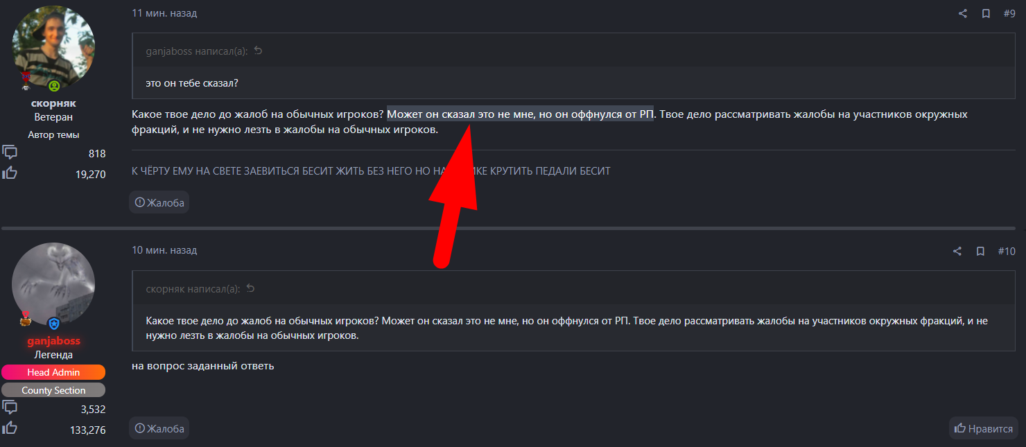переносит жалобу с обычных игроков на окружных, сразу отклоняет. пишу жалобу на него: мне отклоняют и говорят, что игрок - участник окружных фракций, хотя сам игрок это отрицает