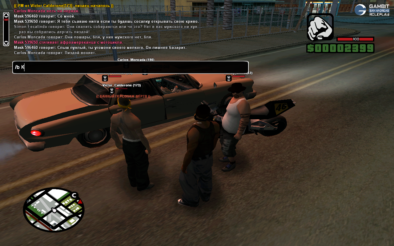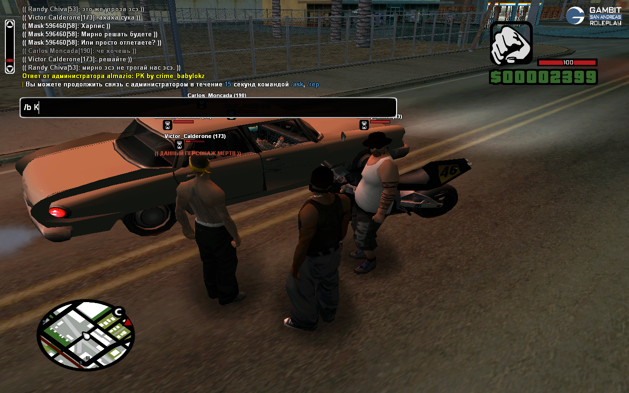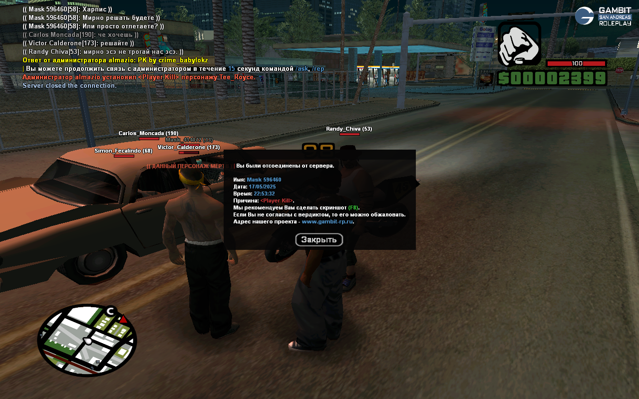 Объясняю ситу, мы рисуем граффити всё по РП. К нам подьезжает сопляк, одного из отцов Харпис. Угрожает смертью и так далее, я в ответ говорю Дословно перевожу "Опасный, но безопасный" После Челики подьехали, после оскорблений в свой адрес и расстреляли нас. Хотя угрозы жизни не было. Мы предложили устроить разборку, но нас убили.