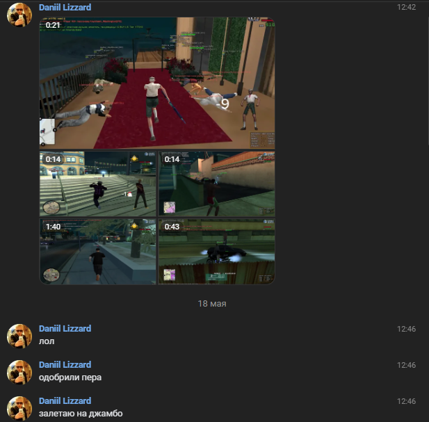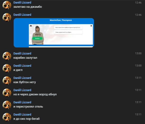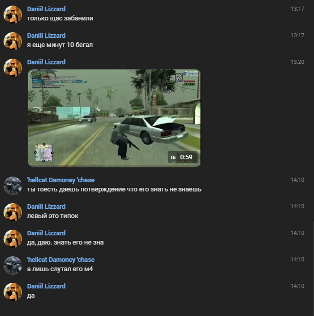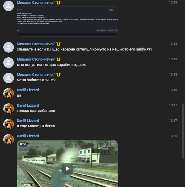Мы стояли с игроком фракции на худе возле машины делали сс - скрины все есть, сска залита, я отгрывал мол недавно закупил у союзной фракции 200 грамм наркоты, открыл багажник через /trunk чтоб на сске было видно открытый багаж, пару строчек написал подбегает Maximilian Thompson который лутает карабин с 200 пт и дигл, 100 грамм кокаина, вижу мне уже пишет мой игрок пиши жалобу я сделал скрин, я посмотрел увидел там его ник, начал писать ему в пм - просто верни оружие ты нам оборвал сс, он пишет хорошо уже бегу, релогнулся несколько раз, я ему написывал в пм мол верни оружие по хорошему я не буду заливать он пишет - я отдам прости в итоге он ничего не отдал, я залил жалобу которуб одобрили но до моей жалобы уже пошла жалоба на массовый дм с моего оружия которое украли с багажника, пацан на спавне(маркете) начал дмить весь спавн и проезжающие машины с аима - фрапсы и его сообщения как он пишет залутал карабин и дигл мне скинул мой бывший друг который сидел в их какой то кф все док-ва что он меня не знает и я его знать не знаю потдверждены его же сообщениями, ему одобрили перса и как там видно в его соо он радовался этому - видимо какой то чсник которому одобрили аккаунт, ЭТО ЕЩЕ НЕ ВСЕ - там есть фрапсы как дмит не только он, а его друзья, рубят людей с бензопилы и расстреливают парней с снайперки.