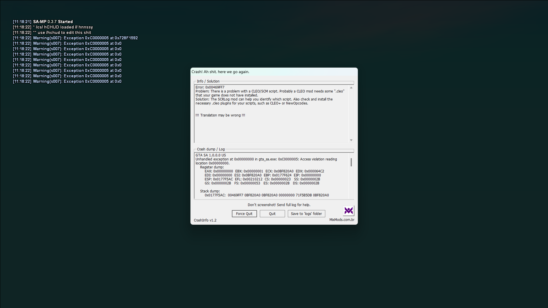 SA:MP не перестаёт удивлять. Поставил SCRlog, чтобы посмотреть ошибки оп-кодов — игра запустилась и ХУД работает. Криво, но работает.