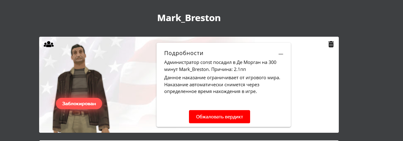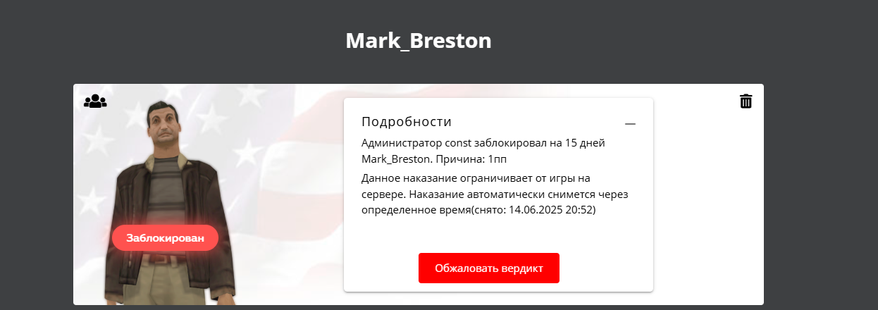 А потом выдаёшь мне бан за 1 ПП, хотя можно было пред или варн хотя бы. Оскорблений не было, только нецензурные слова. Зачем ты так делаешь? Ты наверное вообще хороший человек? Ебать ты поступаешь мне просто же не приятно видеть такое лицо как ты на проекте это каким человекам надо чтоб считать это за нарушения когда я ударил 3-4 раза человека или двух человек и убежал дальше играть, наверное я ебать им игру сломал дружищь, нет блять как человек просто выпустить из деморгана и сказать извиниться да даже если бы ты выпустил я бы подошел и извинился если бы не попросил потому что не трудно так потом берешь и спецом добиваешь кикая когда попросил выпустить и сидишь игноришь)) И потом выдаешь мне бан за 1пп хотя пред дает или варн хотябы, оскорблений не было а нецерзуные слова. Зачем ты так делаешь?
