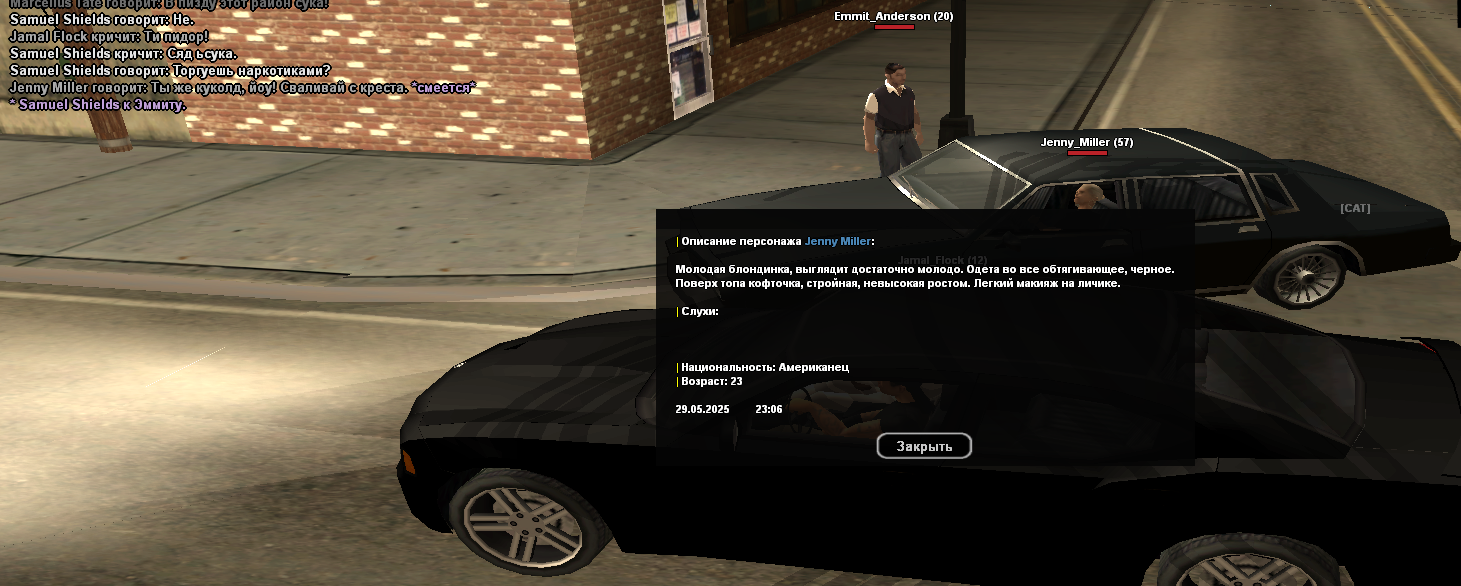 Суть жалобы: рассказываю ситуацию с самого начала. играла я на районе значит, тут прикатывают данные персонажи и начинают меня оскорблять. мой персонаж не стерпел, кинул оскорбление в ответ и уехал. началась погоня, данные персоны гнались за мной, после отстали. спустя время снова начинают гнаться за мной и открывают стрельбу (незнаю по какой причине). по итогу все пули летели в меня, я заехала в сто, выбежала и там меня добили уже.