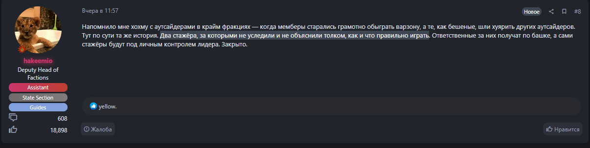 Бля, видно по скринам ситуацию же. Мне позвонили, сказали, там копы у нашего СТО. В инвентаре маски не было. Ситуация экстренная. Ты бы все эти факты изначально расписал в первой жалобе, а не придумывал каждый раз новый повод как-то задушить. Я тоже остаюсь при своем мнении. Да и рейнджеры те играли залупу и уже были наказаны.