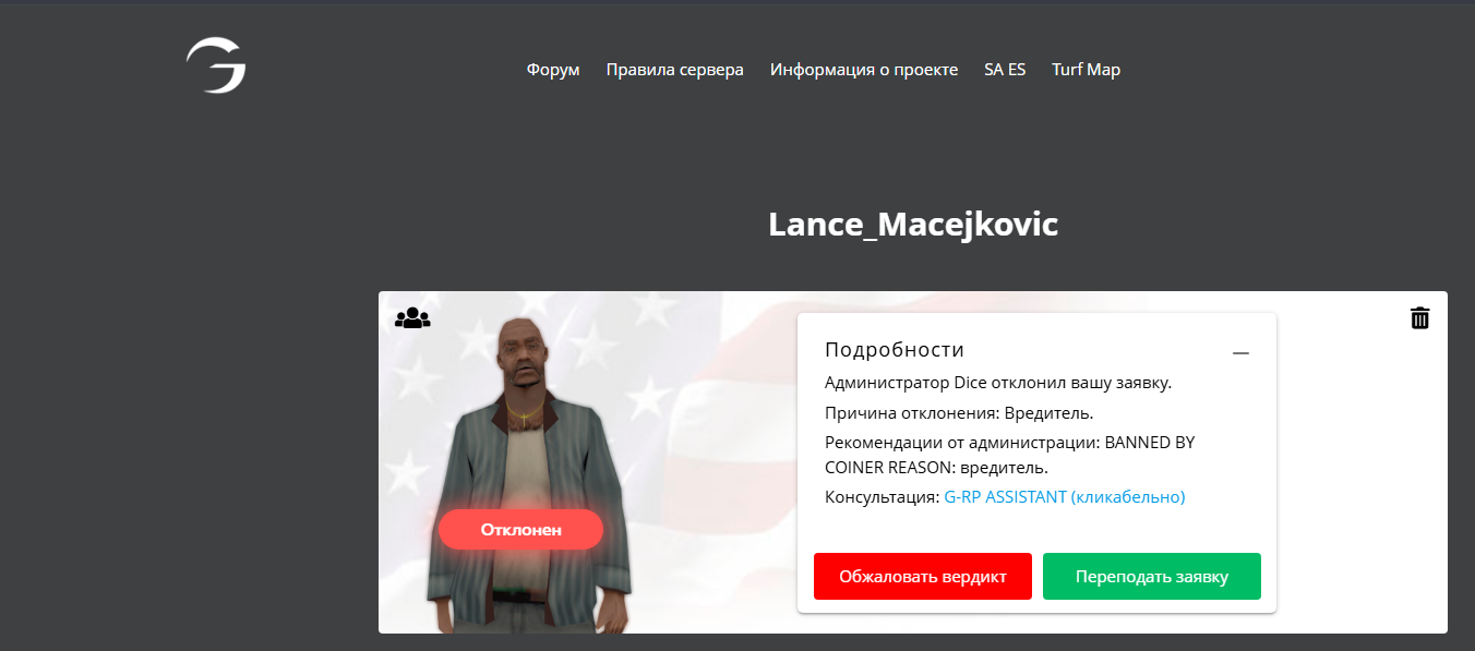 Суть жалобы: В общем, сегодня была ситуация, у меня произошла стычка с одним человеком, около садка, чисто словесная перепалка была, потом он говорит, мол щас я тебя порешаю, я его в ответ послал на 3 буквы, после чего он начинает стрелять, я был с товарищем, мы благополучно убили его и его поддельников, через буквально минуты 3 мне прилетает бан за якобы 2.2, ну ладно, думаю, может действительно нарушил какие правила, просто играю не очень давно... Но при попытке создать нового персонажа, мне отклоняют его, по причине "ВРЕДИТЕЛЬ", интересно уж, в каком месте я вредитель? Никаких запрещенных программ я не использую, до этого меня за подобное не банили, что к чему вообще без понятия. Не прошу уж разбанить предыдущего персонажа, т.к. я его уже удалил, но одобрите хотябы этого, ибо я действительно не понимаю, где я навредил проекту.