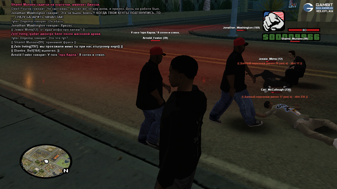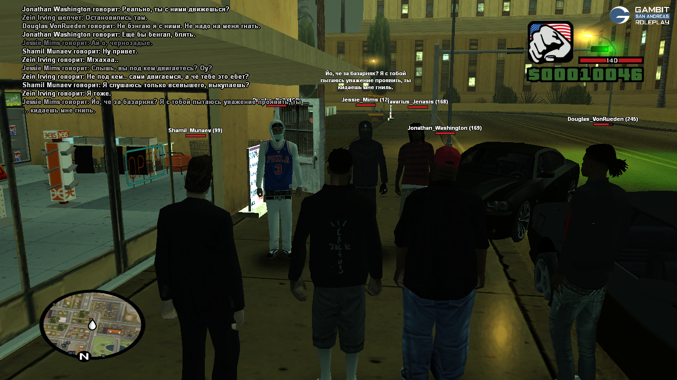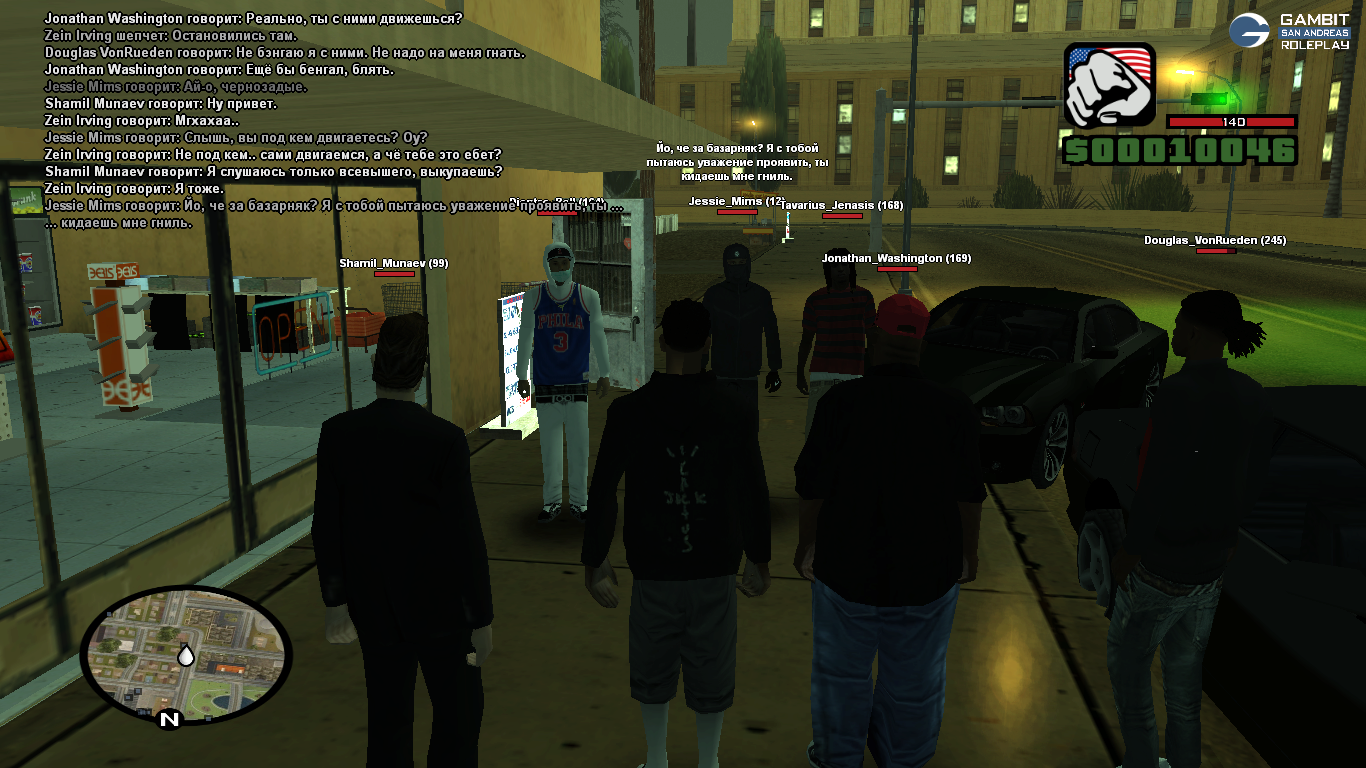 Я вместе со своим другом Jonathan_Washigton находился на районе. К нам без всякой причины начали приставать вышеуказанные игроки. Поскольку наши силы были не равны, я решил отъехать, чтобы собрать своих товарищей — Shamil_Munaev и Arnold_Foster.