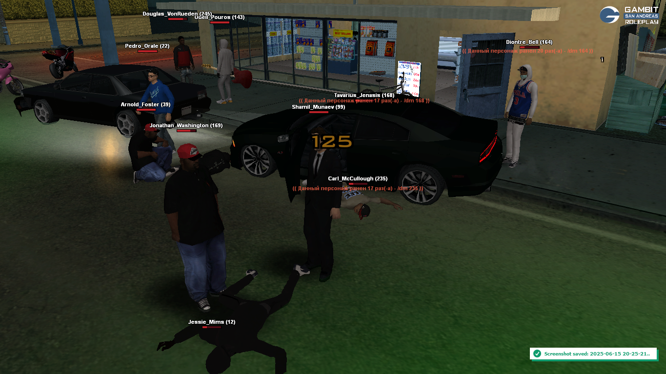 Ситуация в следующем, я отъезжал на время в другое место, далее приезжаю на парковку в ист Сантосе рядом с Клакин Беллом и наблюдаю картину как на крыше стоят около трех человек и один лежит (мой соигрок лежит), далее картина как один из трех начинает резать ножом моего соигрока ( мой соигрок - Дионтри Белл) ну и я не буду просто так стоять в стороне от этого всего, я подъезжаю чуть ближе и открываю огонь по тем кто стоял над телом моего соигрока и один из них повторюсь его резал.