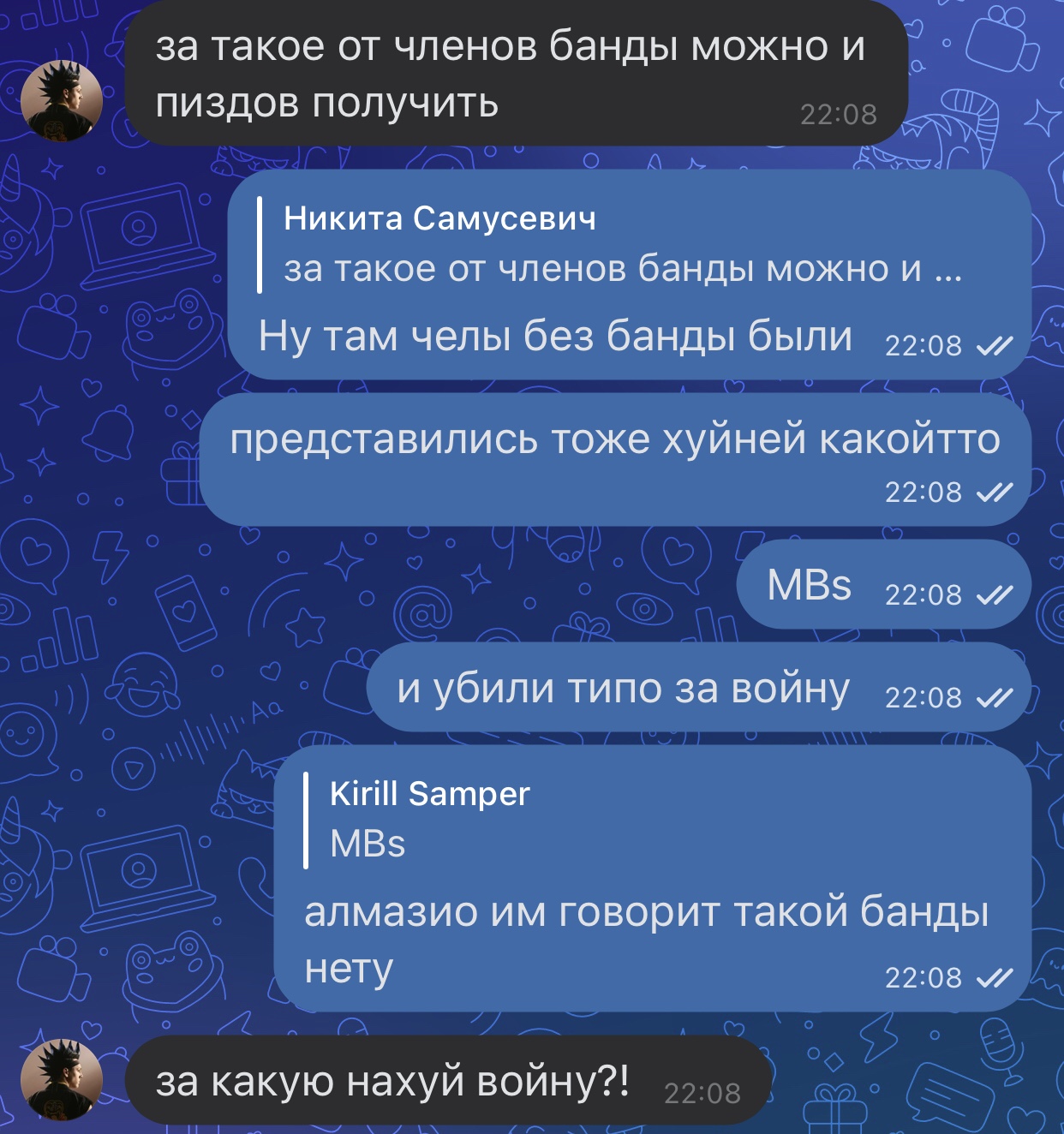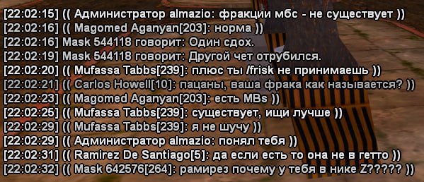 Суть жалобы: Произошла драка, в ходе которой я получил пизды. Человек кидает мне /frisk, у меня открывается меню, я ему пишу - «давай через /do отыграем» Он пишет - «нет» и начинает спамить командой /frisk. После того как я им объяснил что не могу принять, он просто берет и вкидывает отыгровку «достает кольт, шмаляет в бошку рамиреза из за вражды банд». Я не понял что за хуйня, ну думаю, ладно, возьму пк. В итоге эти люди начинают писать мне «бери цк». Пришел админ, говорит им дайте мне название своей фракции, они пишут «MBs”. И говорят ему бань его до цк. Я думаю, что за хуйня, мотива для килла не было, и цк брать не хотелось. Потом оказывается что банды MBs даже не существует по словам админа, после чего я спросил у основателя банды 13th Street Devils White если ли у них вражда с бандой MBs, он ответил «нет». Отправлять в пк из-за того что я не мог принять /frisk - полный пиздец, предлагал им отыграть через /do они не хотят. Более того человек даже не отыграл /frisk, просто вкинул команду и все. Прошу разобраться