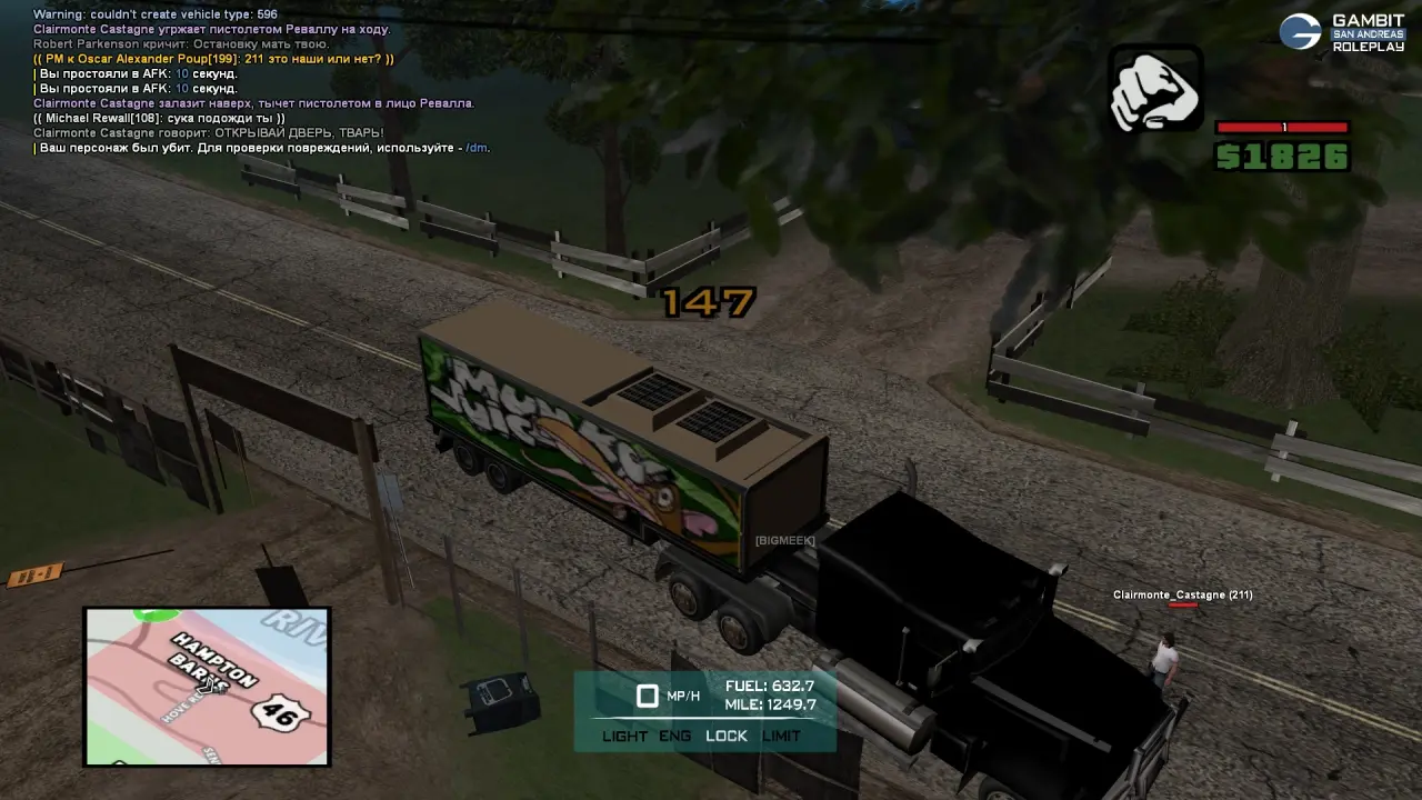 Суть жалобы: Вечером везём с товарищем груз двумя фурами, за нами указывается толпа ВЕЛОСИПЕДИСТОВ СУКА, которые нас по пингу таранят и останавливают угрожая стволом, клаирмонте меня таранит и у меня слетает прицеп, ему пишу " Сука подожди " и начинают стыковать прицеп потому что иначе он просто улетит, а он видимо с желанием пошотаться убивает меня без отыгровки, на которую у него время было. За данным игроком как можно видеть 2.3, так как причины не было, не отыгрыш оружия и повер гейминг потому что ехал на велосипеде за фурой, которая могла его отправить к праотцам если его протаранила