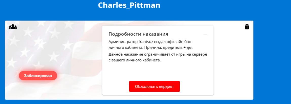 Суть жалобы: Забанили ещё в апреле, по причине ДМ + вредитель. Вину я свою осознал и понял, хотелось бы уже поиграть на сервере, во фракцию залететь может. Ситуация в тот день не очень вышла, ну я оправдывать себя и не пытаюсь, надеюсь лишь на помилование ваше.