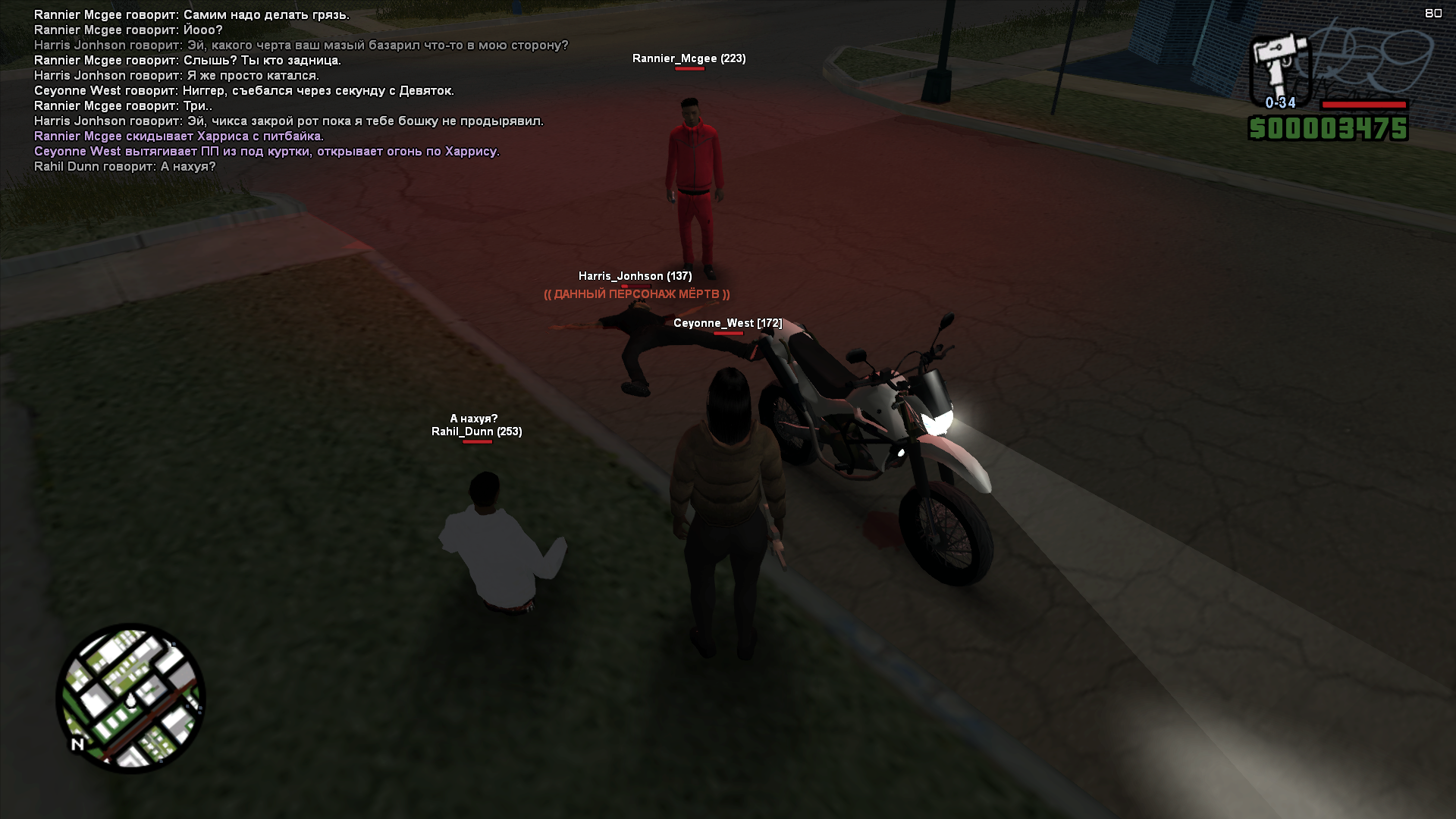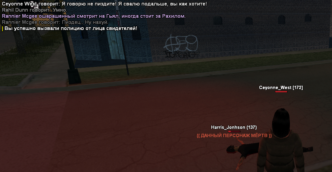 Суть жалобы: Приехал я значит к ним узнать почему их нигер что-то базарил про меня что-то и хотел чтобы он ответил за это, они начали говорить типо кто такой и т.д, потом резко Rainner играет что сталкивает меня с мотоцикла, затем Ceyonne открывает по мне огонь, не знаю причину моего дма, после всей ситуации я хотел у игроков узнать причину шота на что получил ответ грубостью, вообщем Rainner меня бил ножом, а Ceyonne растреляла посреди улицы, думаю вы во всем разберётесь.