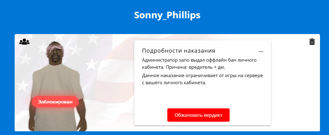 Не скажу, что я самый пиздатый и примерный игрок сервера, но и не думаю что заслуживаю 3ий необоснованный чс. Администратор САНО выдал блокировку за дм + вредительство, после ситуации где он был убит с 3 неизвестными парнями. Забанен был не только я, но ещё и 3 человека(лишь 1 из которых являлся мне знакомым).