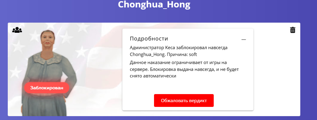 Суть жалобы: Эта жалоба просто крик души! Сидел я в хате как ни в чём не бывало, решил навестить бабусю... В самый неподходящий момент. Инга Михайловна сидела и плакала из-за действий администратора, после чего из-за её кардиомиопатии случился инфаркт миокарда. Прошу администратора одуматься, изучив материал я увидел то что она только-только зашла на сервер и получила бан, прошу не оставлять дело просто так... И если имеется на то возможность выдать моральную компенсацию за принесённый ущерб и извиниться администратору. Пусть предоставит все необходимые доказательства насчёт того, что могла нарушить Баба Гага на вашем сервере. Если честно я разочарован, у меня просто НЕТ СЛОВ...