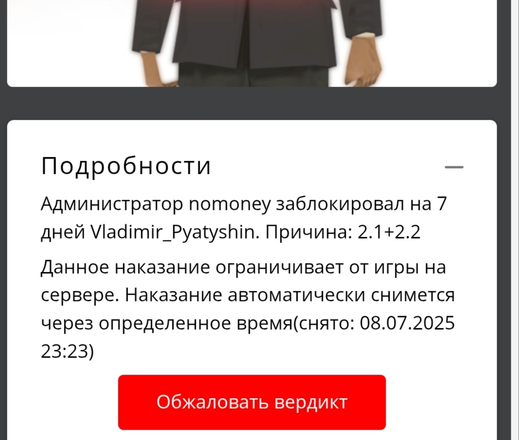 Суть жалобы: За что я получил наказание? Я лишь дрался в драке которую я начал не я, в итоге 7 дней бана, я даже ничего такого в чат не написал!