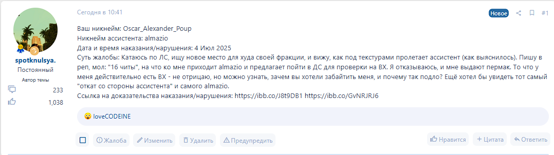 Суть жалобы: Катаюсь по ЛС, ищу новое место для худа своей фракции, и вижу, как под текстурами пролетает ассистент (как выяснилось). Пишу в реп, мол: "16 читы", на что ко мне приходит almazio и предлагает пойти в ДС для проверки на ВХ. Я отказываюсь, и мне выдают пермак. То что у меня действительно есть ВХ - не отрицаю, но можно узнать, зачем вы хотели забайтить меня, и почему так подло? Ещё хотел бы увидеть тот самый "откат со стороны ассистента" и самого almazio.