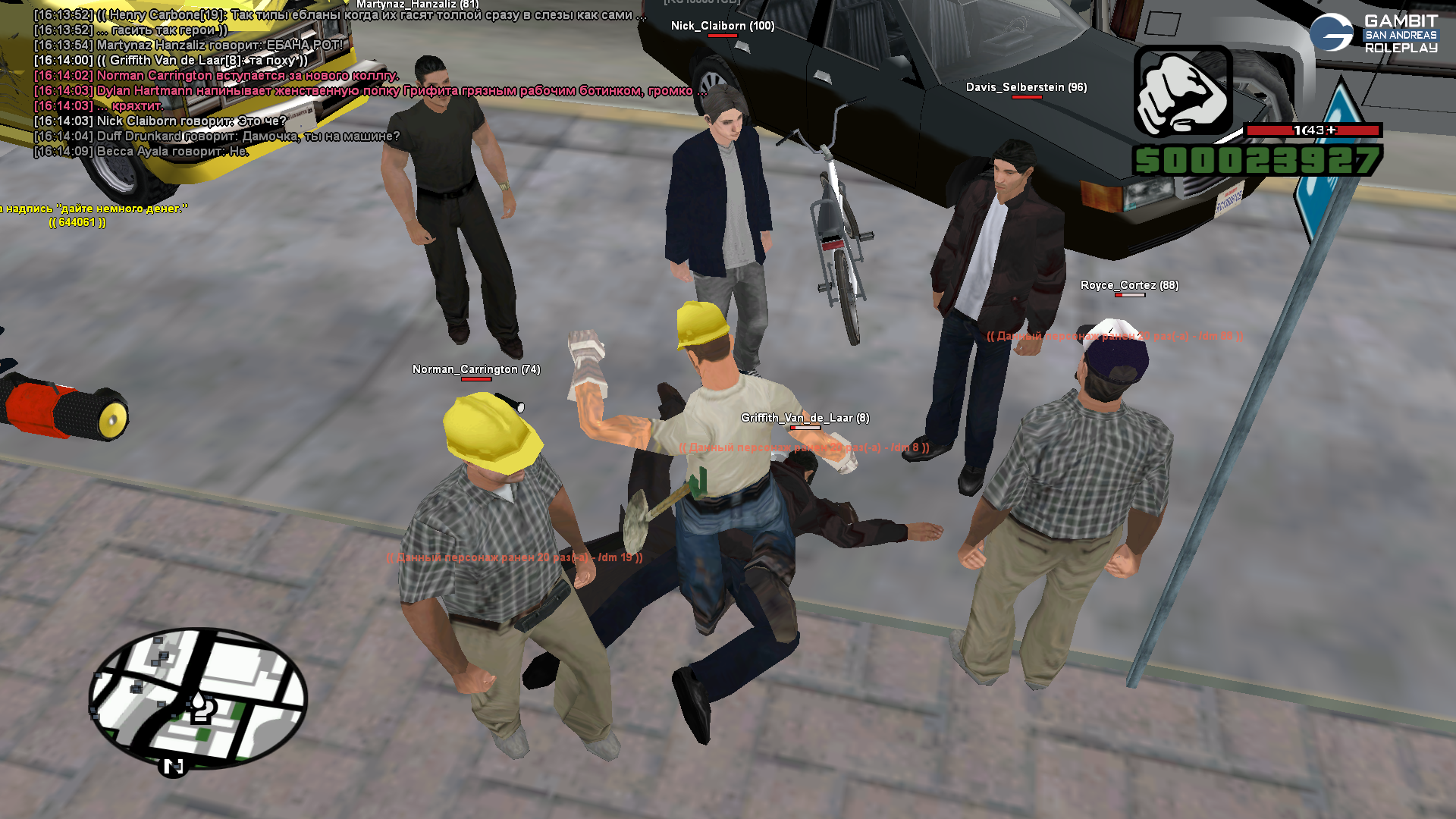 Суть жалобы: Стоял на спавне со своим КОЛЛЕГОЙ (играем независимых строителей действующих по приказам мэрии), принимали в ряды добросовестных тружеников сочувствующего вольнодумца, который решил связать свою жизнь с общественно полезным делом. Отвлеклись на некоторое время и видим, как Griffith_Van_De_Laar принимается избивать новоиспеченного пролетария вместе со своими друзьями лишь за то, что тот решил примкнуть к нашему рукодельному кружку. Вандылар будучи истероидным, психически нестабильным мальчиком-подростком, ранее был искренне оскорблен тем фактом, что люди обращают на нас большее внимание, чем на него, поэтому решил использовать радикальные меры в борьбе с нами, ранее неоднократно пытаясь спровоцировать нас что в IC, что в ООС. За эту ресентиментарную попытку вернуть себе мнимые титулы местного авторитета, работяги решительно напинали женственную жопу Вандылара и его друзей. Спустя 20 (примерно) секунд мне и моему коллеге был выдан бан сроком на 7 дней за неотыгрыш повреждений. Хотелось бы увидеть какой-то регламент или свод правил, в котором будет описан тот срок в 20 секунд, за который игрок, по мнению администратора, обязан написать отыгровку. Это при условии, что ситуацию мы не покидали, стояли так же над побежденными и отыгрывали произошедшее. Так же не очень понимаю, почему за неотыгрыш повреждений баны не были выданы тем, кто эту самую драку и начал.