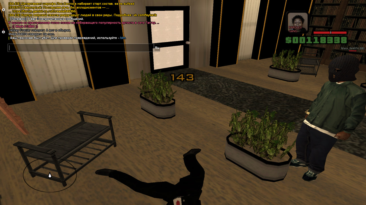 Суть жалобы: без ведомой причины положил на пол. явно пытался ограбить, я в свою очередь прогрузился только и пытался уйти от текстур, в меня пошла очередь.
