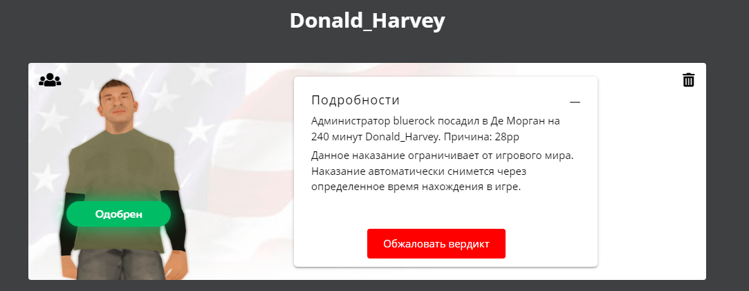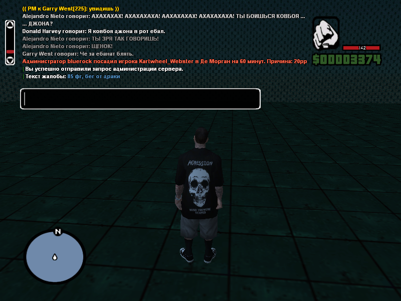 Данный админ уже не в первый день только и делает, что днями сидит и наблюдает за игроками нашей фракции, при этом постоянно старается придумать нам наказания. Недавно так же незаслуженно выдавал ДМГ одному из игроков фракции, который сняли. Очень хотелось бы конечно же избавиться от несправедливо выданного наказания, а что самое главное - все таки добиться санкций в сторону этого админа.