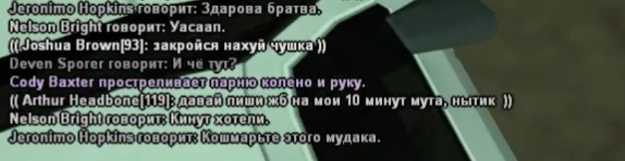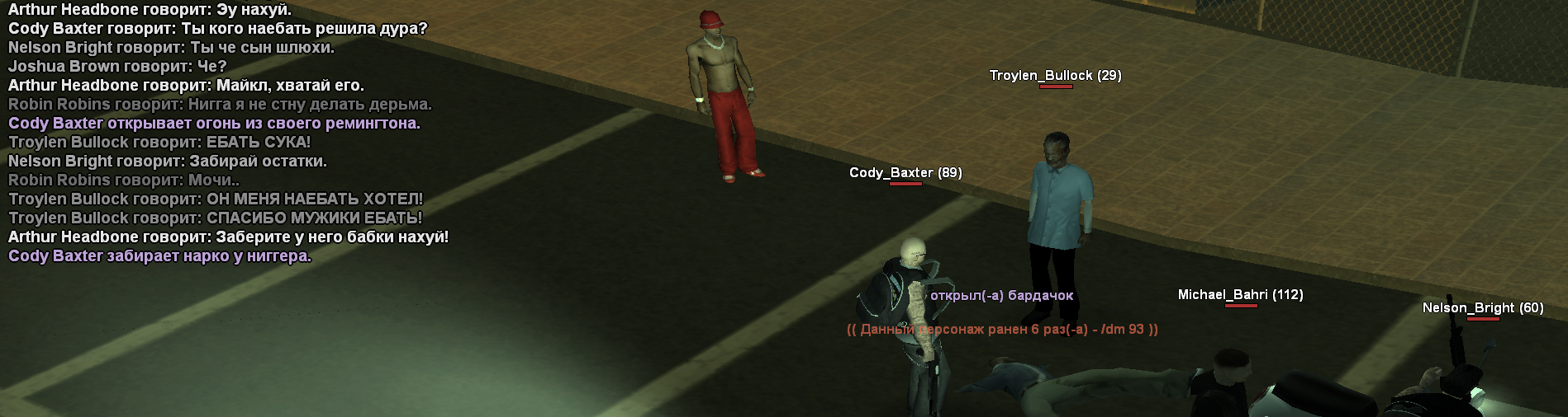 Суть жалобы: продал типам траву на углу, по ним сразу видно было что это фгшеры, ну короче потом приезжаю на Джефферсон, стою с типом общаюсь и 4 типа с карабинами приезжают, не ссут доставать их на оживленной улице, стоять там. В итоге стреляют мне несколько раз в тело чтобы я упал и можно было ограбить (меня не добили, был в первой), начали грабить (я им не успел дать бабло, тк спорил с ними), в итоге 2 отыгровки кинули как отбирают у меня нарко и деньги и когда я начал спорить с ними в ooc, они начали мне говорить "завали ебало" ну и в итоге после ограбления добили меня и положили во-вторую и уехалию. По их отыгровкам и поведению видно что чисто макаки ашотеры приехали в гетто пострелять, а это даже не оскорбление, я сказал факт