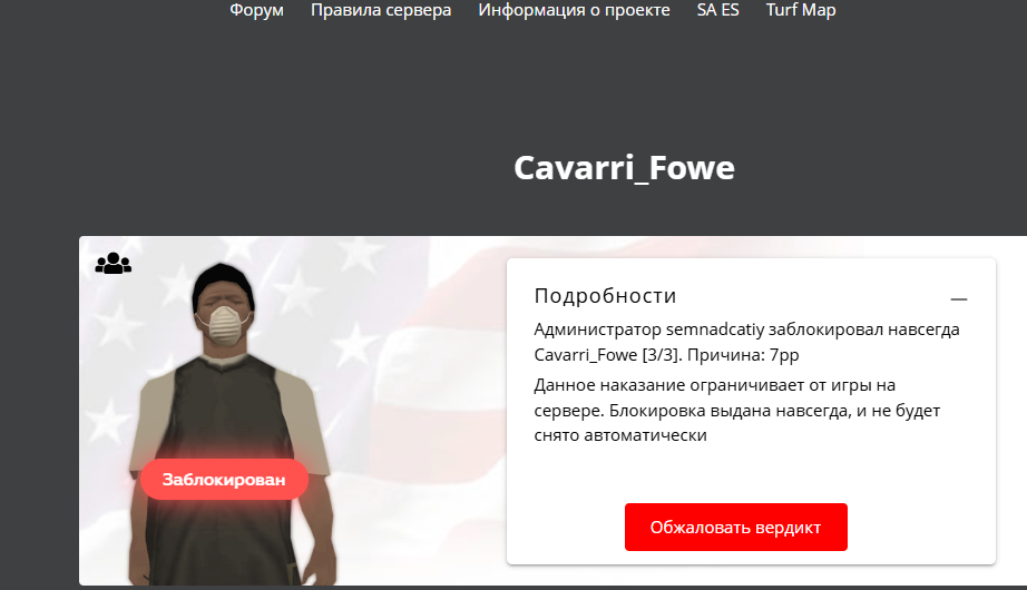 Суть жалобы: Прошу перевыдать мне бан на 2 дня, ну или ваще просто снять варн. Потому что я бежал и прыгал никому не мешал, время 12:42 и никого нету на улице что бы я кому то мешал. Я соблюдаю это правило всегда и никогда не банихоплю например от тех драки.