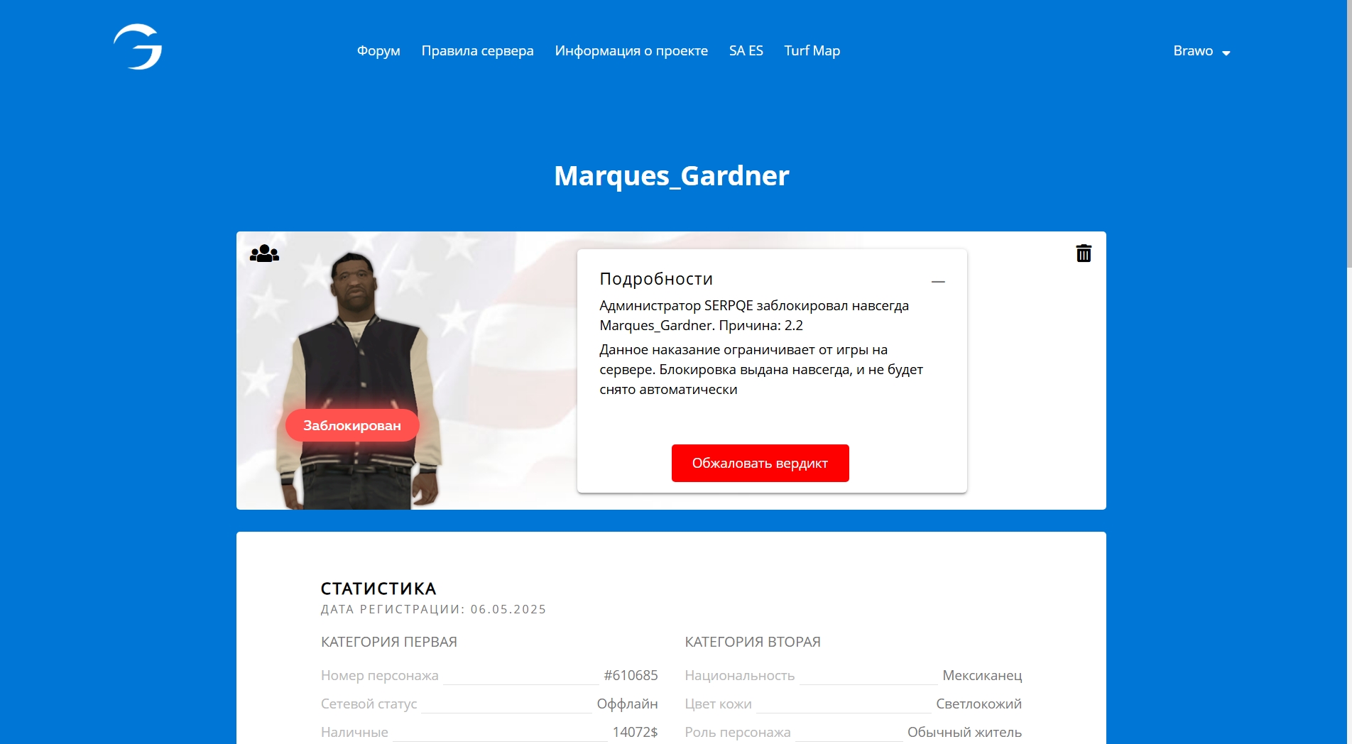 Суть жалобы: почему же я получаю блокировку? пацан заезжает на заднее дома, где впринципе нету метки, байтит и мешает игровой атмосфере. получил пулю за такие приколы. Серпов где? правильно сидит смотрит, может он и был этим чёрным?