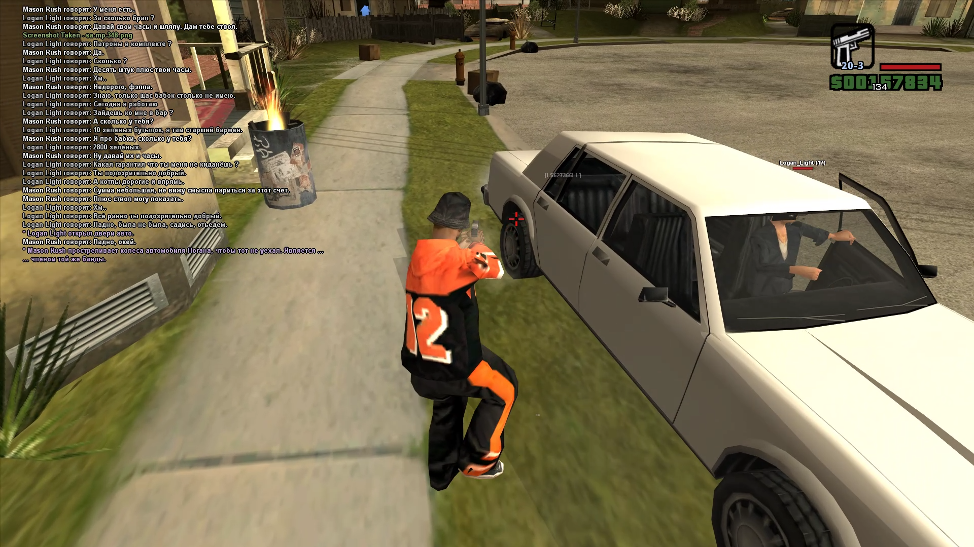 я увидел чела на гэнтоне, который сидит в своей машине. подбегаю к нему. типо такой. здарова, че как дела? хотел предложить наркотики. но об этом потом. он мне говорит, что до него докопались мои соигроки и он хочет им отомстить. напрямую говорит, что "хочу отомстить, но ствола нет". ясен перец щас он поедет, найдет ствол и будет мстить)