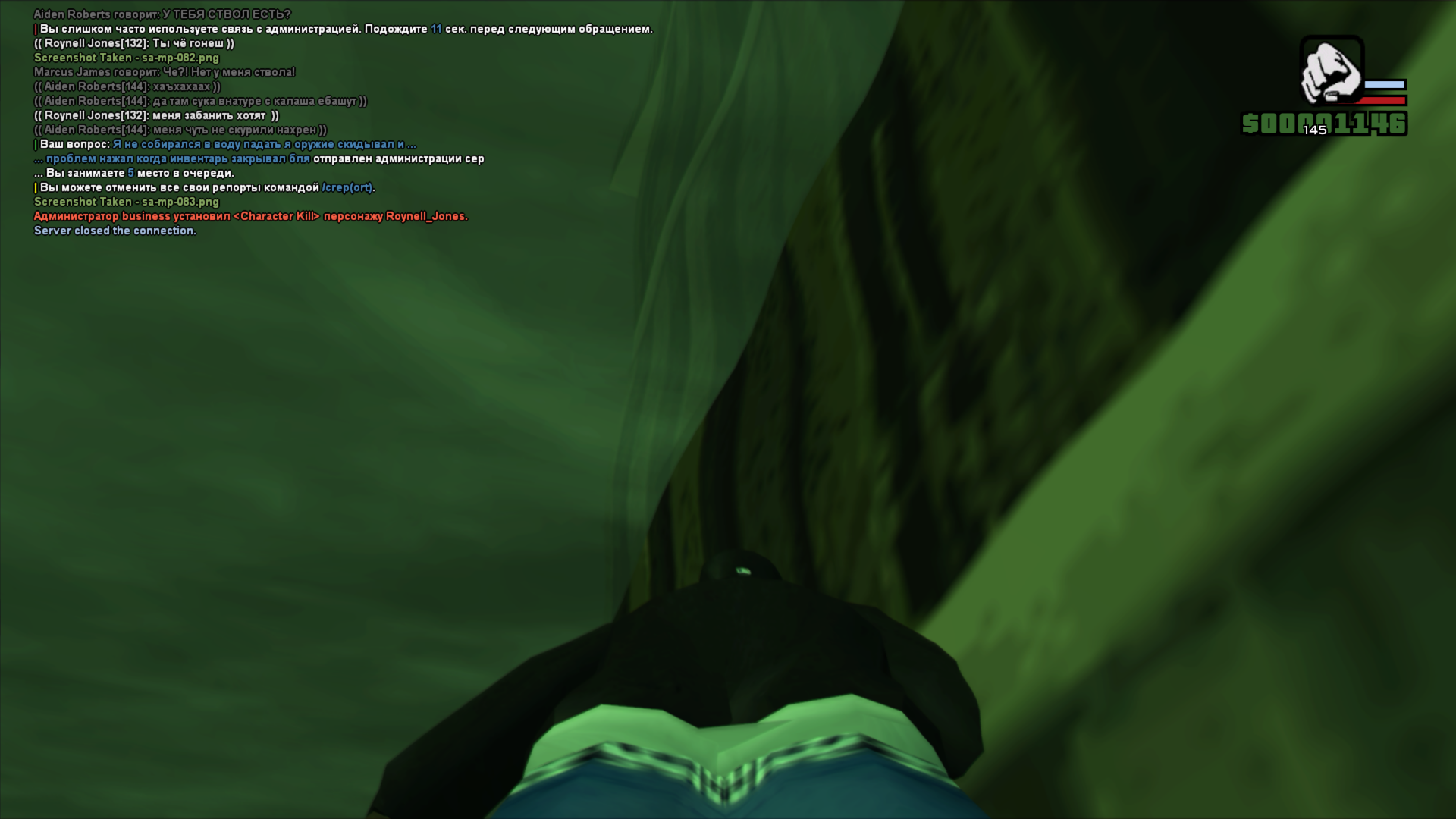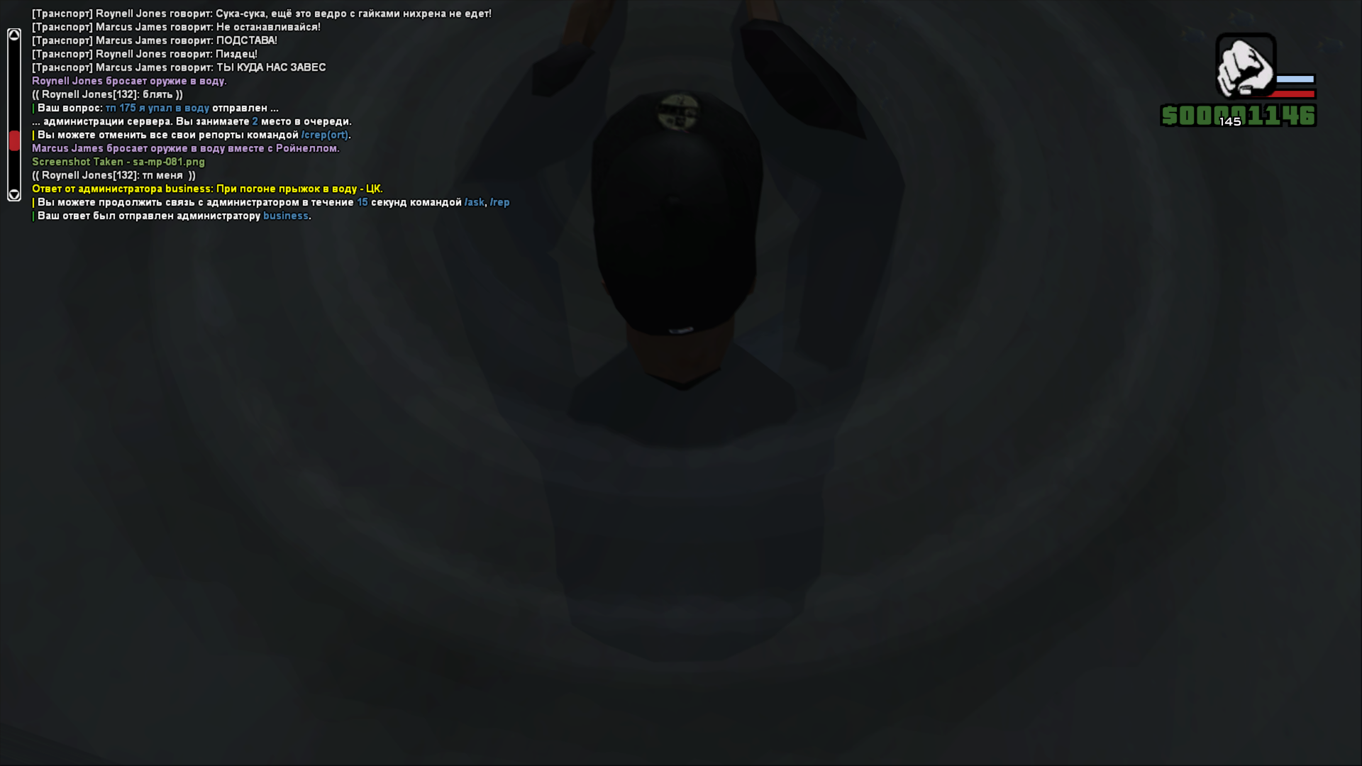 Суть жалобы: Скрывались от блюстителей закона, в итоге попали в западню, когда заехали в доки Паломино-Крик. Выбежали из машины и все в рассыпную, я спрятался за контейнерами и отыграл, что выбросил оружие в воду, что хотел сделать и технически, но в итоге когда инвентарь закрывался, случайно свалился в воду. На видеозаписи на 01:40 секундах слышно характерные звуки как я падаю в воду и в /b чате я сразу выразил не довольство. Написал в репорт о помощи, чтобы меня ТПхнули наверх к моему приятелю который стоял там же, в итоге мне администратор отвечает, что кто от погони в воду сигает тот автоматом в СК, я думаю что за бред. Я же не намеренно это сделал, тем более сразу отписал в репорт чтобы меня вытащили, я не собирался от полиции прыгать в воду, я сбрасывал ган и гасился за контейнерами молясь на удачу, что они меня не повяжут. Оружие сбрасывал из-за того, чтобы в случае поимки мне не накинули больше срока за хранение. Прощу пересмотреть моё СК, на скриншотах и видеозаписи - мои действия были явно не целенаправленные.