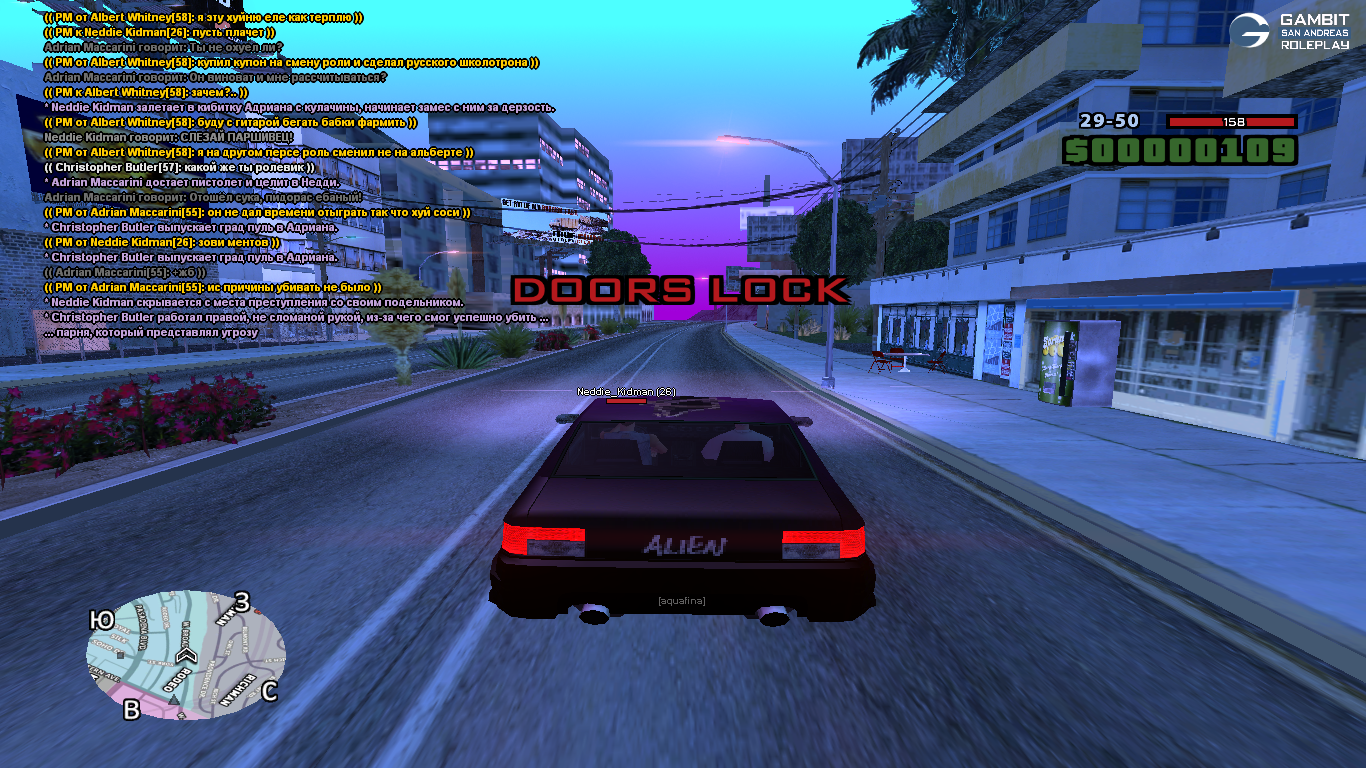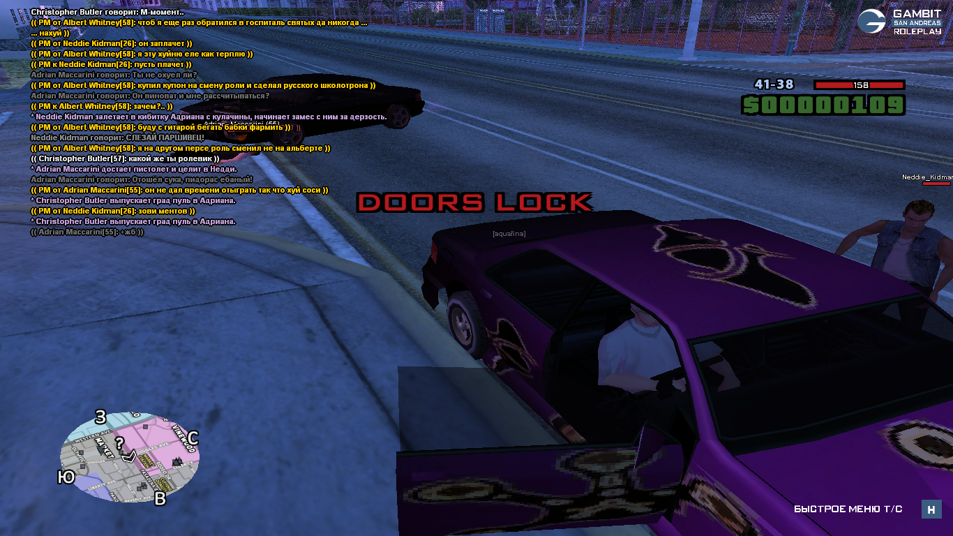 Суть жалобы: Короче еду на султане по главной, тут слева вылетает серый зр350. Начинаем дтп играть. Christopher_Butler начинает медленно уходить пешком типа раненный дохуя. Я беру сажусь в его тачку и начинаю ее хуярить в состоянии "афекта". (я согласен, спорный отыгрыш, тут решайте уже сами). Затем тип возвращается, идет тоже в ответ ебашить мою машину, но я успеваю закрыть дверь. Потом приезжает его друг Neddie_Kidman на фиолетовом султане, говорит плати бабки за ремонт и затевает драку системную, при этом не дав мне ХОТЯ БЫ секунды среагировать. Дальше я успеваю отбежать на крышу и достаю пистолет для самозащиты и целю в него. В это время Christopher_Butlerтот отходит по тихому к своей машине, подбегает назад, достает узи и расстреливает меня благополучно, и съебывает. При этом я даже не заметил отыгрыша вызова полиции. Можете проконсультировать, вот это вот всё было вообще ИС причиной для убийства моего персонажа? К сожалению фрапса нет, но есть скриншот всего чата