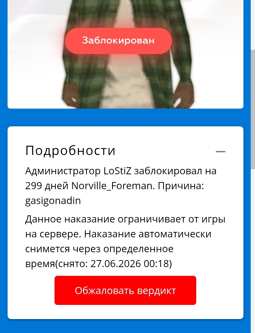 Суть жалобы: Что еще за причина такая? Я давно не играл за этого перса, зашел, а тут меня банят на 300 дней