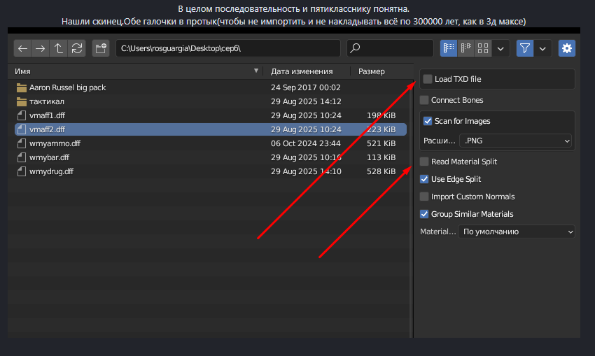 Сап, вот тут галочку поставь когда скин грузишь, и с тхд все в пнг достань в одной папке чтобы было с дфф. И нормально загрузит