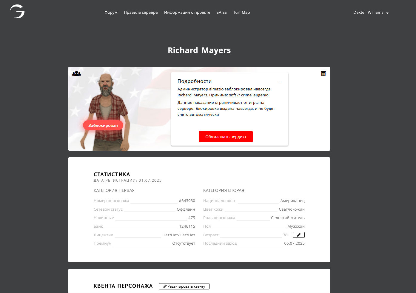 Суть жалобы: Примерно в июле этого года была игра за данного персонажа, но чуть позднее персонаж был забанен навсегда за софт по жалобе - https://forum.gambit-rp.ru/threads/548955/ Буду признателен, играл с Wall Hack, но считаю за такое время сделал для себя выводы по поводу данной ситуации, и хотелось бы попросить об амнистировании данного персонажа. С того момента не играл с скриптами дающие преимущества, и надеюсь мнение касательно данного эпизода изменится. Готов ответить на вопросы.