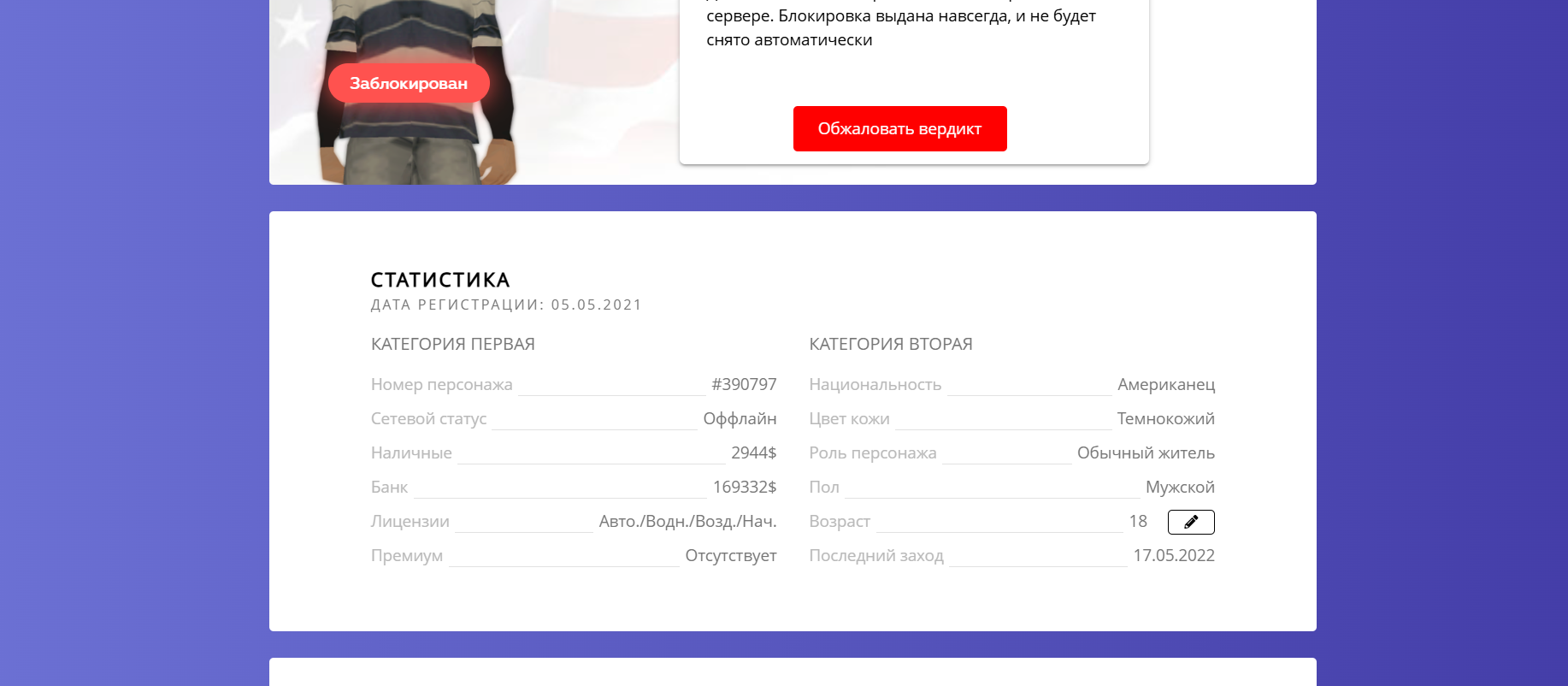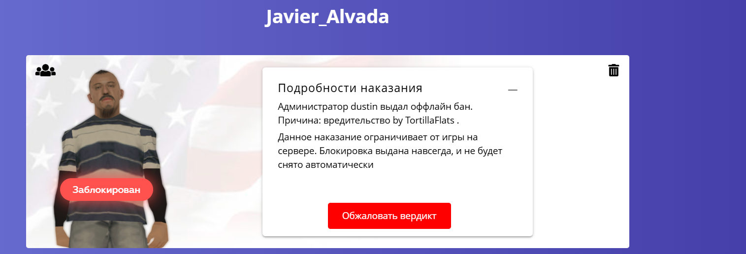 Суть жалобы: в 2022 году играя в латиноамериканской банде, я сел в машину к вроде-бы нашим союзникам, приехав на уиллоуфилд тут-же мне выдали бан by Tortilla Flats, считаю, что я уже давно перерос эту ошибку, не могли бы вы выдать разбан персонажу, так как этот бан лишь портит репутацию на сервере мне, хотя я даже и не причастен к этому.