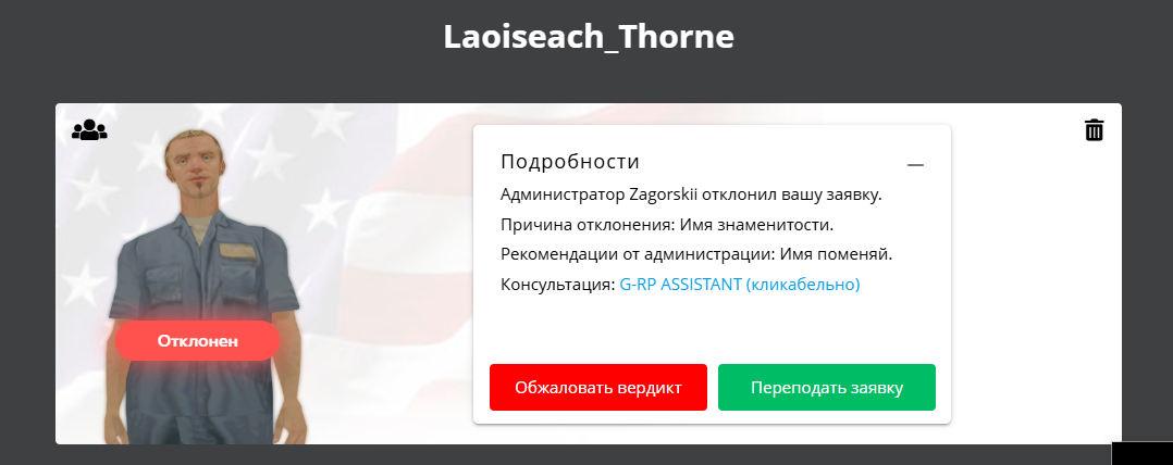 Суть жалобы: Добрый вечер, получил реджект персонажа из-за "Имени знаменитости". Никнейм был придумал совместно с сотоварищем для игры двух братьев, руководствовались классическими ирландскими фамилиями и именами в перечне возможного, так что кто такой Лашех Торн в реальности я понятия не имею. Рассудите если не прав, потому что ничего кроме лекарства по запросу "Laoiseach_Thorne" мне не гуглится.