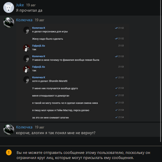 Про других отбросов, которые занимают ключевые должности на этом проекте мне нечего сказать. Еще забавен тот факт, что в беседе в телеграме меня просто так забанили, видимо из-за того что модераторам, у которых еще губки не обсохли, сильно обиделись на одно из моих сообщений. Забавляет и тот факт, что все сообщения по поводу вернуть старый гамбит - удаляются, ведь Ярика это сильно злит в последнее время, а может и с самого начала.