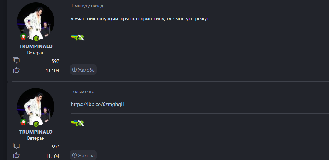 Суть жалобы: Фангэйм, ДМ, выдуманные причины для нападения. Всё видно в чате, на одних из скриншотов видно как трумпинало без причины нападает на моего соигрока, выдумав, что он на него покушался, бегунок прошу доказательств.