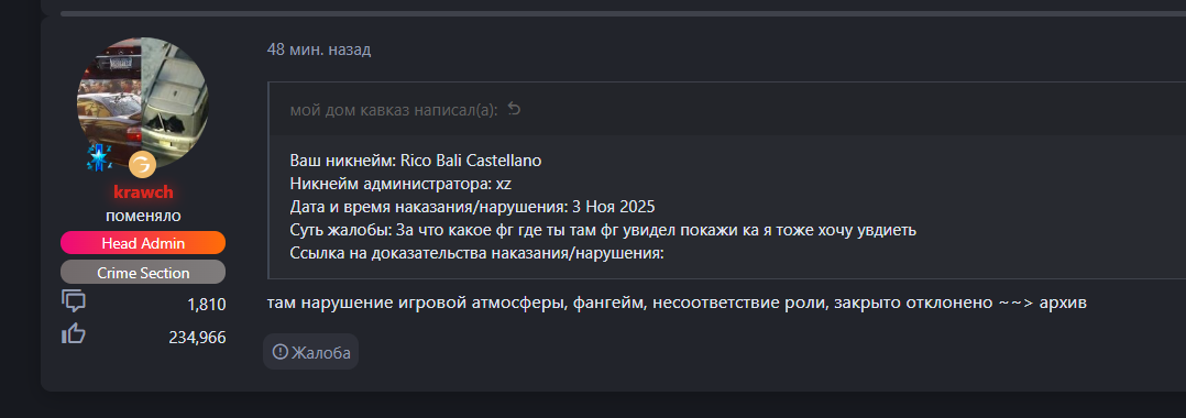 Ссылка на доказательства наказания/нарушения: https://forum.gambit-rp.com/threads/557478/#post-7103613