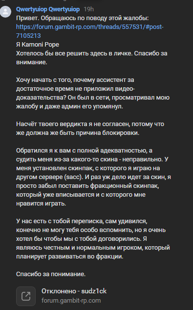 Хочу правильный рассмотр жалобы и предоставление доказательств. Насчёт вердикта krawch я также не согласен, мы с ним побеседовали, но так и не пришли к какому-то выводу. На момент той ситуации у меня стоял другой скинпак, который я использую на другом сервере, если это так важно (в остальном использую фракционный скинпак, который можно заметить в моих недавних сообщениях). Я являюсь вполне адекватным игроком и не позиционирую себя каким-то нарушителем, я хочу с удовольствием поиграть фракцию. Спасибо за понимание.