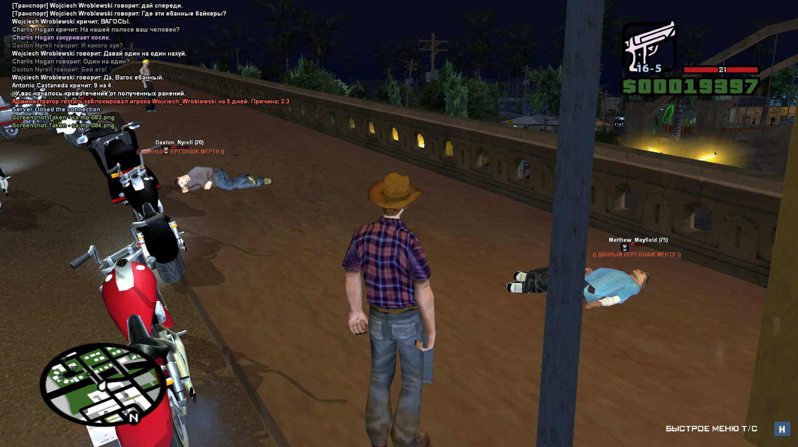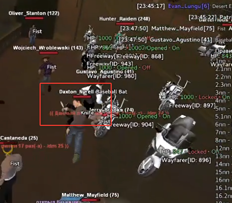В целом на скриншоте прекрасно видно, что из драки 1x1 они решили толпой загосить меня. Так еще и наглости потом нож хватило достать. Самое забавное, ссылаясь на правила проекта. Я вообще могу использовать оружие, если на меня кидается толпа.